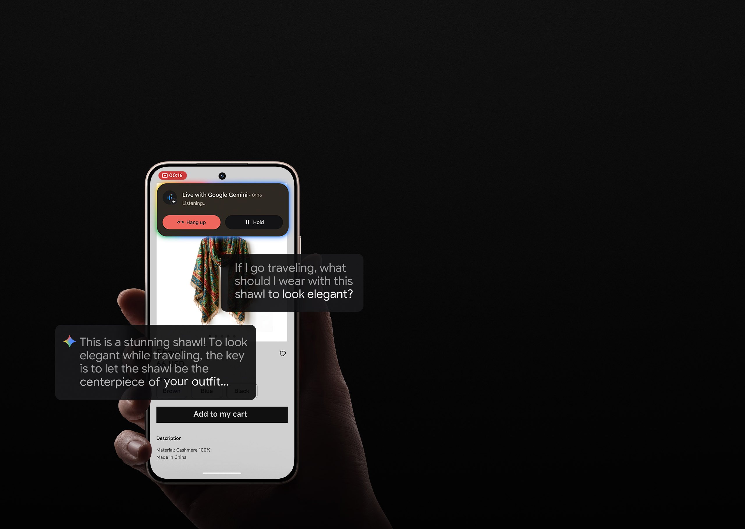 Tanyakan pada Gemini tentang apa saja yang Anda lihat. Bagikan kamera atau layar Anda dalam percakapan Gemini Live.