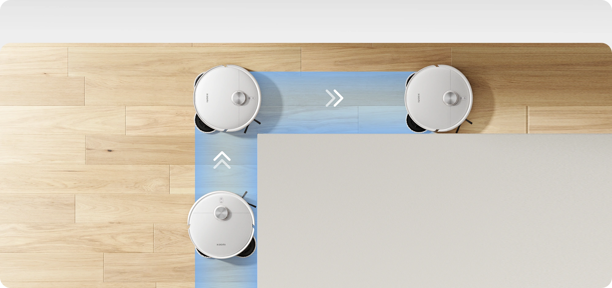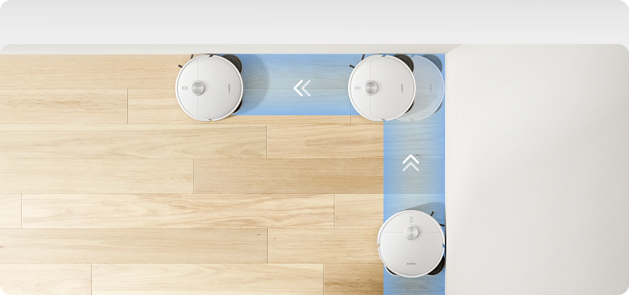 *Jangkauan pembersihan sudut 100% dengan celah 0 mm hingga ke tepi: Data diperoleh dari Xiaomi Internal Labs. Dalam kondisi pengujian laboratorium dengan mode penyedot debu standar, jangkauan pembersihan area tepi di sudut kanan bagian dalam mencapai hingga 100%, dengan sikat samping yang menjulur untuk menjangkau jarak 0 mm dari area tepi. Hasil sebenarnya mungkin berbeda tergantung lingkungan dan kondisi penggunaan. Harap merujuk pada pengalaman sebenarnya.