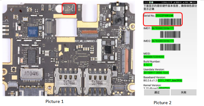 Dari model Redmi Note 2, ponsel Xiaomi mulai laser pada motherboard kode dua dimensi FSN (motherboard kode, dengan keunikan, tidak diulang), seperti Gambar 1 lokasi kotak merah.