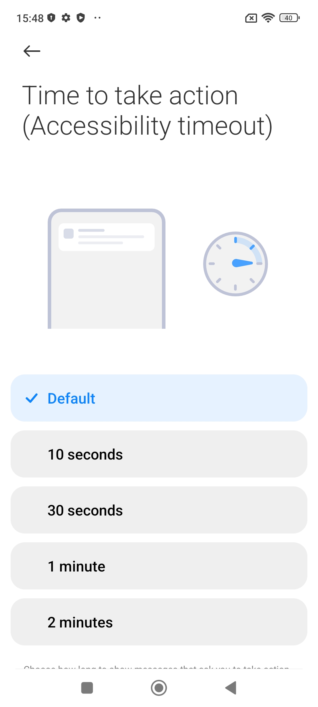 Pengaturan Telepon---Pengaturan tambahan-Aksesibilitas-Fisik-Waktu-untuk-mengambil-tindakan-Waktu untuk mengambil tindakan (Batas waktu aksesibilitas), jika waktu diatur ke opsi lain selain default akan menyebabkan popup pemberitahuan menghilang melampaui waktu default. Fitur ini dirancang untuk menyimpan pop-up notifikasi di layar untuk jangka waktu yang lebih lama agar pengguna memiliki lebih banyak waktu untuk mengoperasikan konten notifikasi yang relevan, dan beberapa pengguna mungkin memerlukan waktu ekstra untuk memeriksa kontrol atau mengoperasikan pop-up.