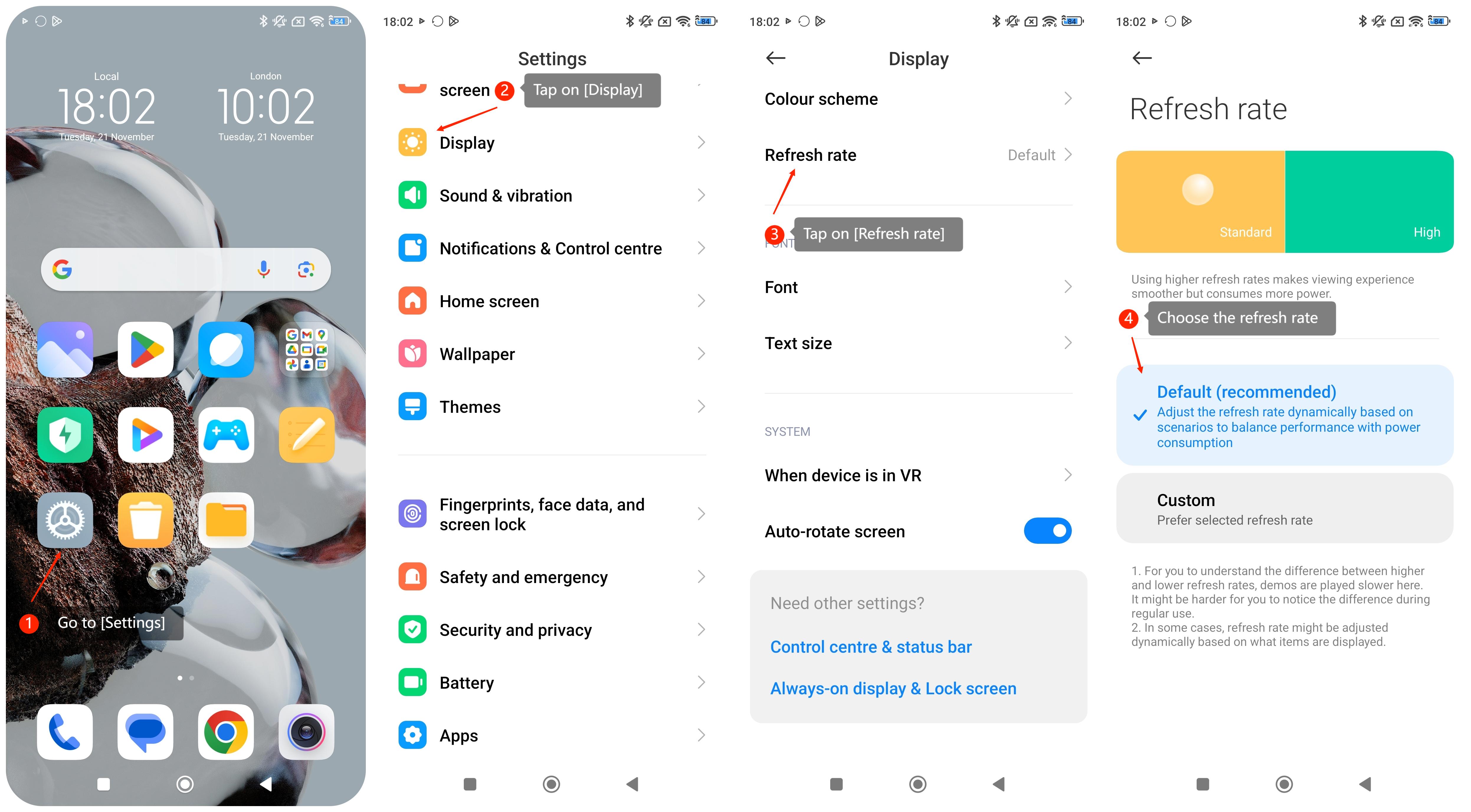 1. Kecepatan refresh default direkomendasikan dan dapat menyesuaikan kecepatan refresh secara dinamis berdasarkan skenario untuk menyeimbangkan kinerja dengan konsumsi daya;