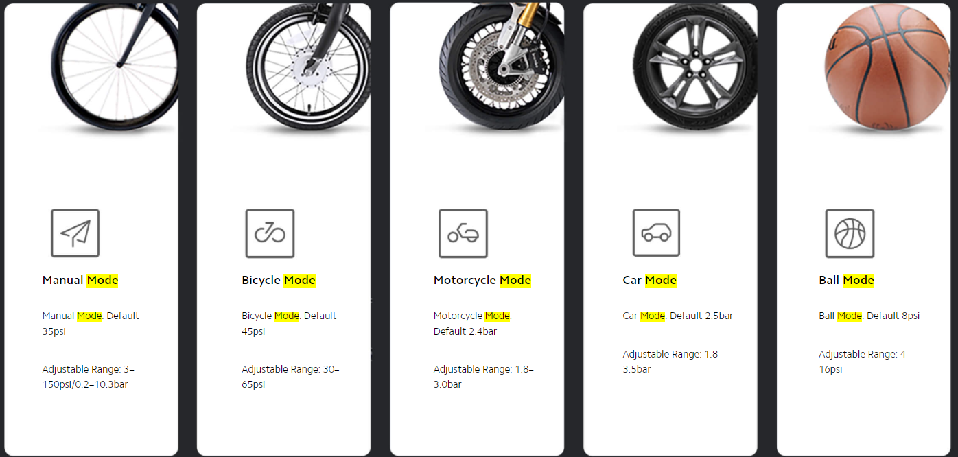2. P: Apa saja kegunaan dari Xiaomi Portable Electric Air Compressor 1S? Modenya apa saja? J: Apakah ini sering digunakan untuk memompa ban dan bola dalam kehidupan sehari-hari. Lima mode pompa yang berbeda sebagai berikut—masing-masing dengan nilai tekanan udara yang sudah ditentukan—mencegah pemompaan yang berlebihan dan bebas khawatir, seperti, Mode Manual, Mode Sepeda, Mode Sepeda Motor, Mode Mobil, Mode Bola.