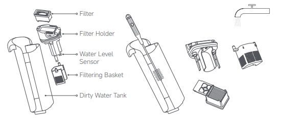 1. Tekan tombol pelepas pada tangki air kotor dan secara bersamaan tarik keluar tangki air kotor; 2. Angkat dan lepaskan dudukan filter di bagian atas tangki air kotor, dan tuangkan sampah dan air kotor di dalam tangki; 3. Lepaskan filter dari dudukan filter, bilas tangki air kotor, filter, dan sensor ketinggian air serta keranjang filter pada dudukan filter sampai bersih. Nota: 1. Sikat pembersih dapat digunakan untuk membantu membersihkan; 2. Saat membersihkan filter, disarankan untuk membuka penutup di bagian bawah filter dan benar-benar bersih dan udara kering untuk menghindari bau; 3. Sensor ketinggian air harus dibersihkan secara teratur untuk menghindari noda yang menempel yang dapat mempengaruhi keakuratan deteksi. 4. Pasang filter, keranjang penyaring, dan dudukan filter tangki air kotor kembali ke jalur semula, lalu pasang kembali tangki air kotor ke ruang hampa. Ketika Anda mendengar suara "klik", itu menunjukkan bahwa instalasi sudah ada.