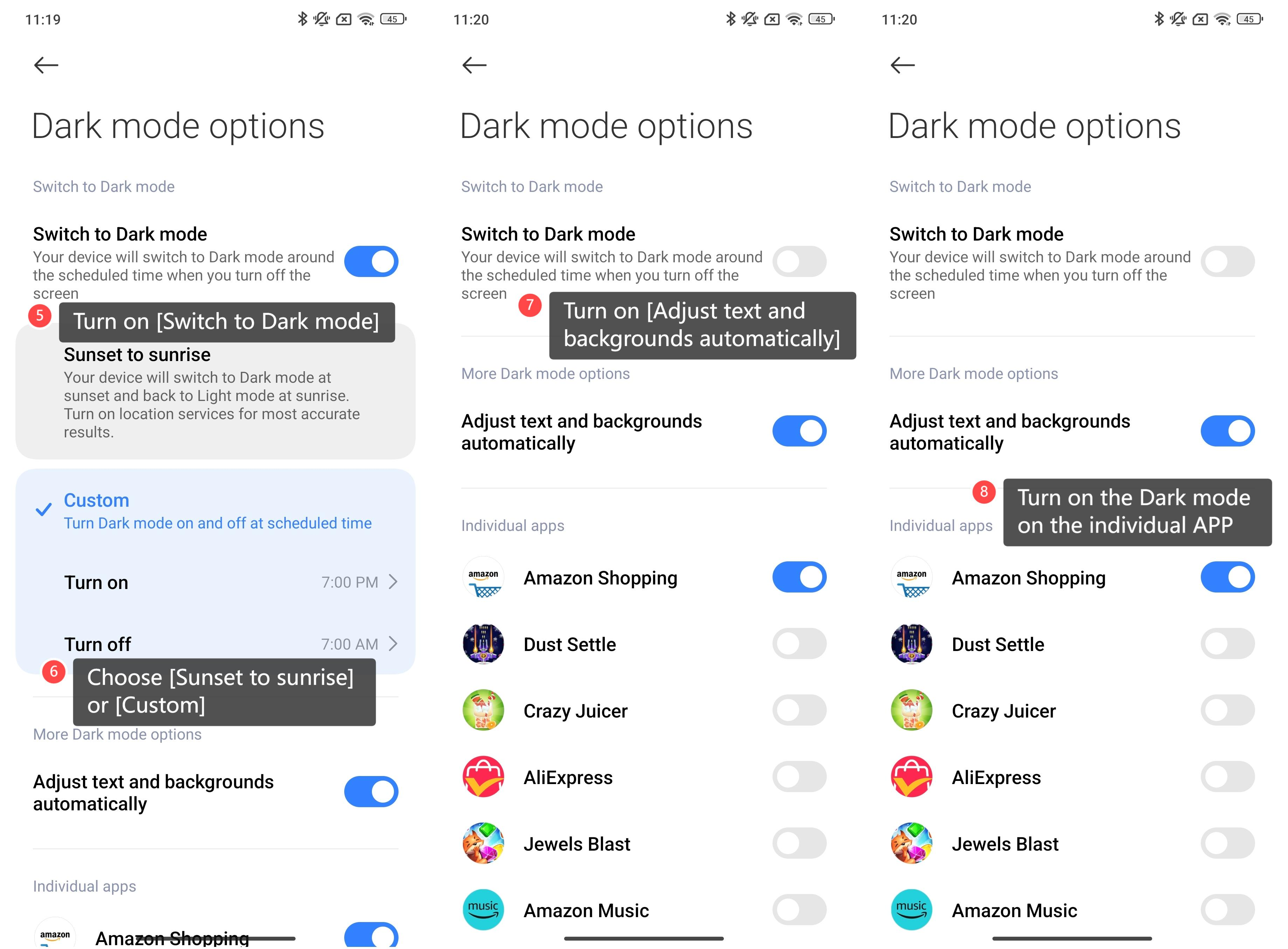5. Di dalam antarmuka, Anda dapat mengaktifkan [Beralih ke mode Gelap], dan perangkat Anda akan beralih ke mode Gelap sekitar waktu yang dijadwalkan saat Anda mematikan layar; 6. Anda dapat memilih [Matahari terbenam hingga matahari terbit] atau [Kustom] untuk menjadwalkan waktu mode Gelap; 7. Anda juga dapat memilih untuk mengaktifkan [Sesuaikan teks dan latar belakang secara otomatis]; 8. Or memilih untuk mengaktifkan mode Gelap pada masing-masing APP.