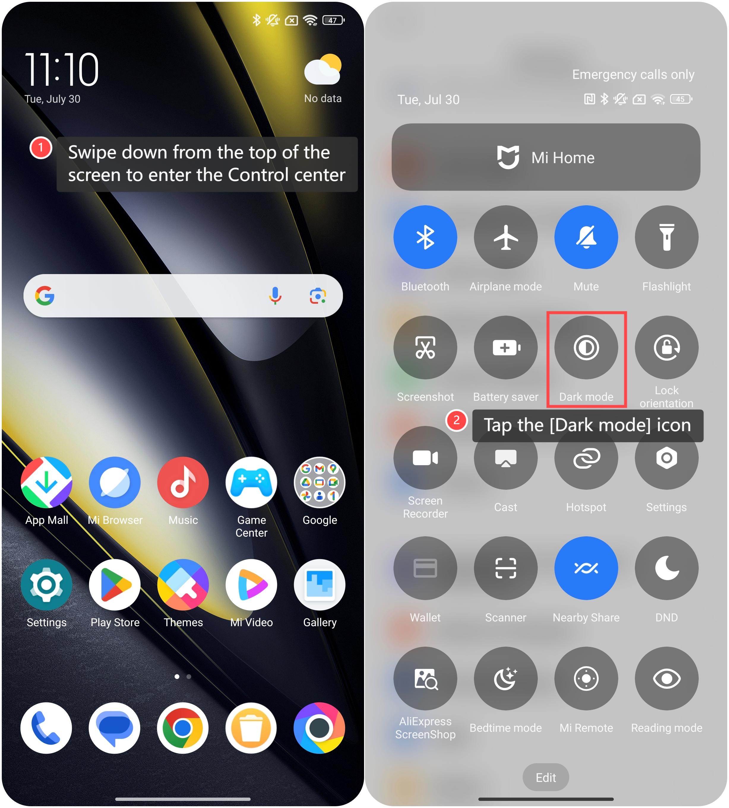Metode 2: 1. Geser ke bawah dari atas layar untuk masuk ke Pusat kontrol; 2. Ketuk ikon [Mode gelap] untuk mengaktifkan mode gelap.