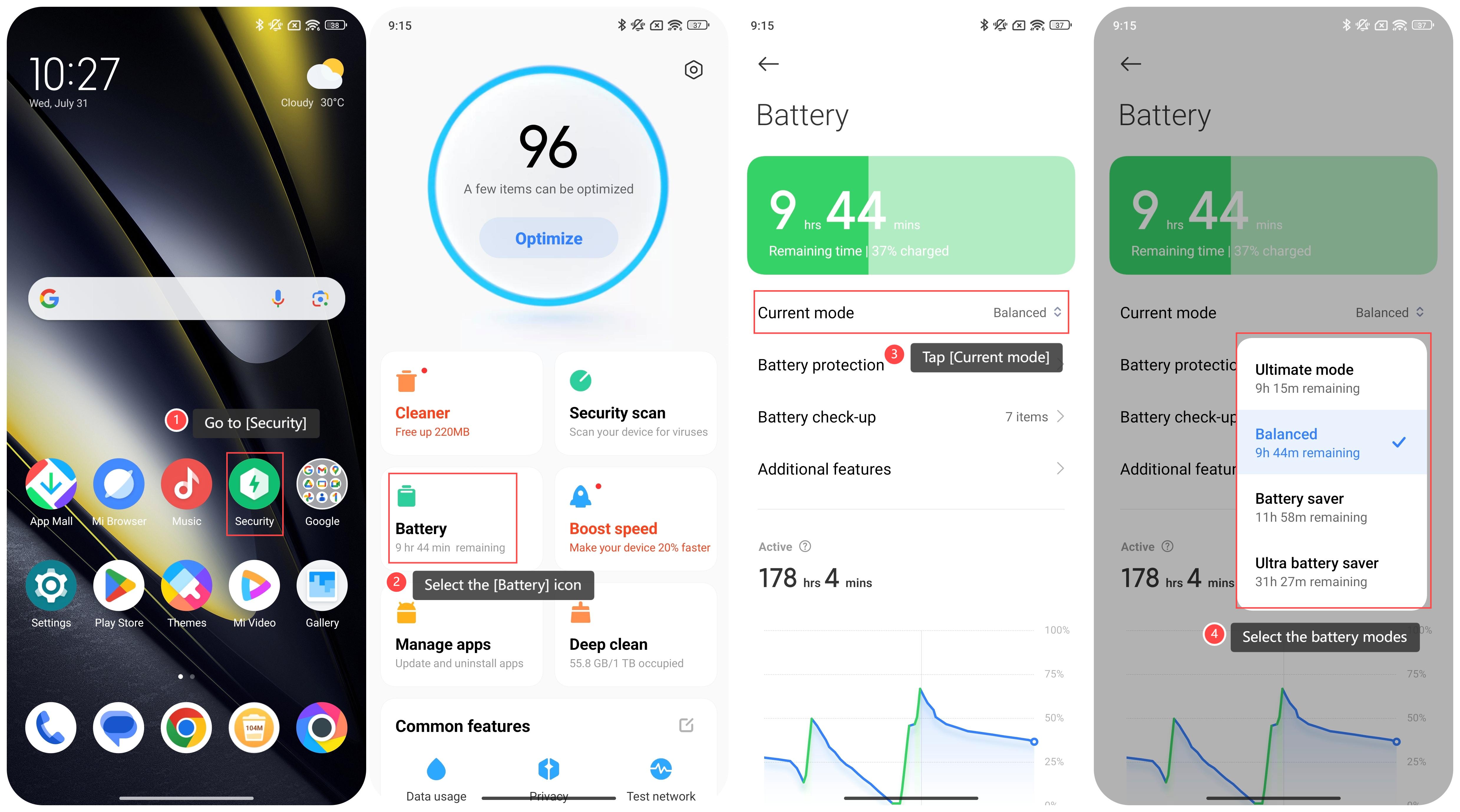 4.Pilih mode baterai dari opsi: [Mode Ultimate], [Seimbang], [ Penghemat baterai] dan [Penghemat baterai ultra].