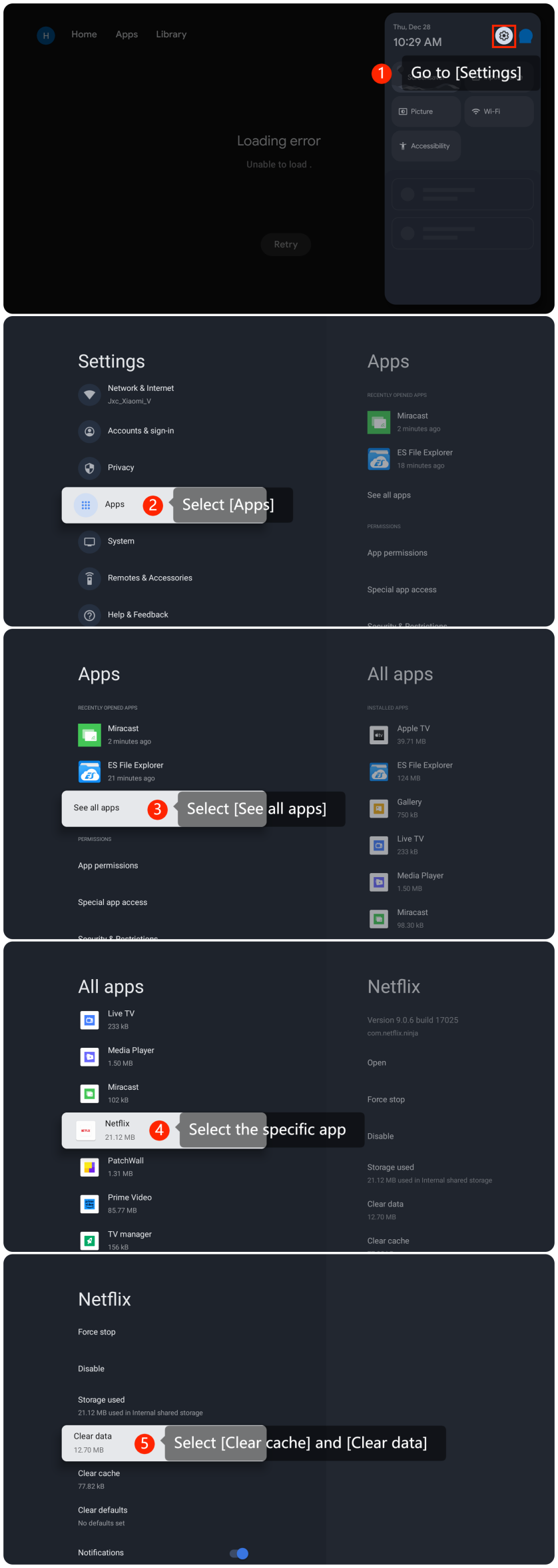 4. Anda dapat menghapus cache dan data aplikasi dengan menavigasi ke [Pengaturan] >>[Aplikasi] >>[Lihat semua pps] >> memilih aplikasi tertentu >>[Hapus masalah ]dan [Hapus aplikasi];