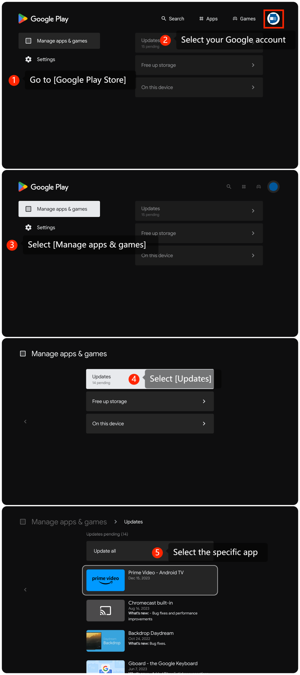 5. Periksa apakah aplikasi telah diperbarui ke versi terbaru dengan membuka [Google Play Store] >> arahkan ke akun Anda >> [Kelola aplikasi & game] >> [Pembaruan] >> pilih aplikasi yang ingin Anda perbarui;