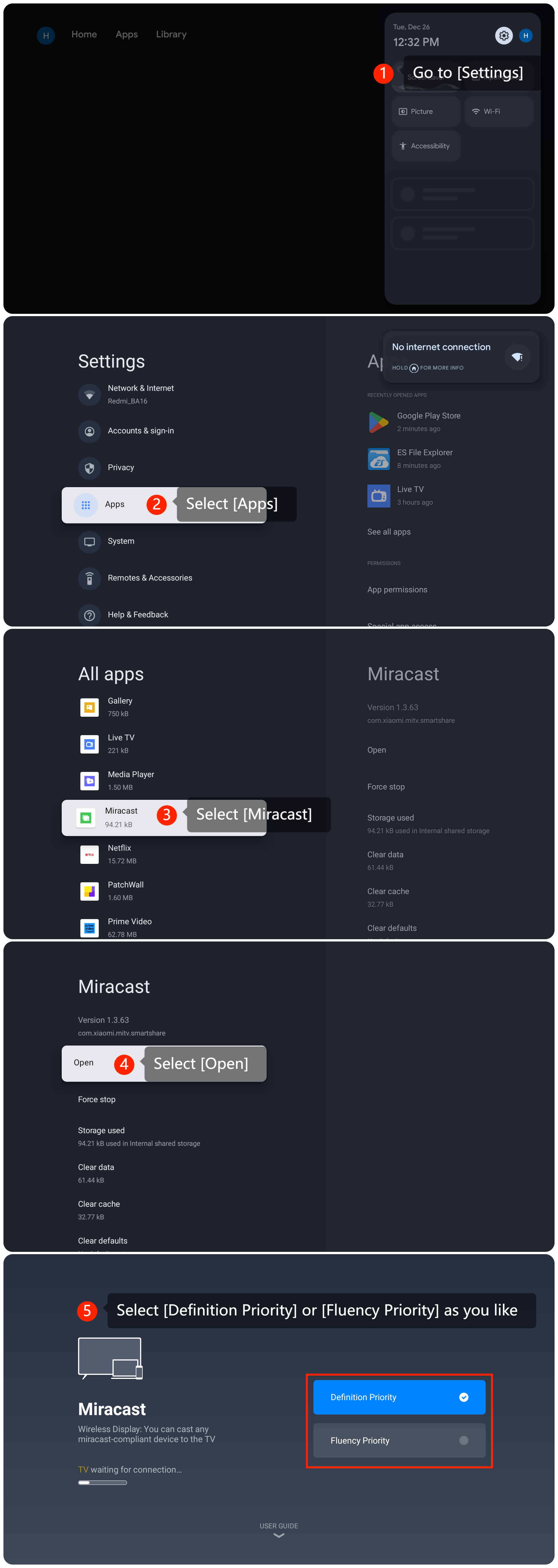 2. Periksa pengaturan Miracastdengan membuka [Pengaturan] >> [Aplikasi] >>[Miracast] >>[Buka]>> Anda dapatmemilih [Prioritas Definisi] atau [Prioritas Kelancaran] sesuka Anda;