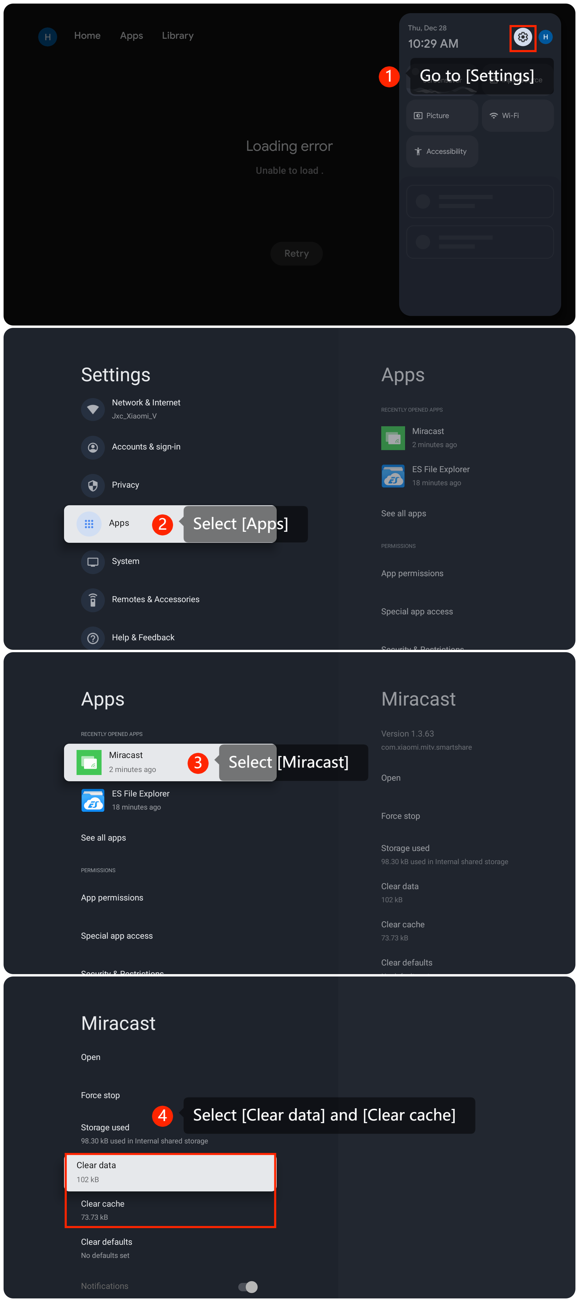 3. Anda dapat menghapus cache dan data Miracast dengan menavigasi ke [Pengaturan] >>[Aplikasi] >> [Miracast]>>[Hapus data]dan [Hapus cache];