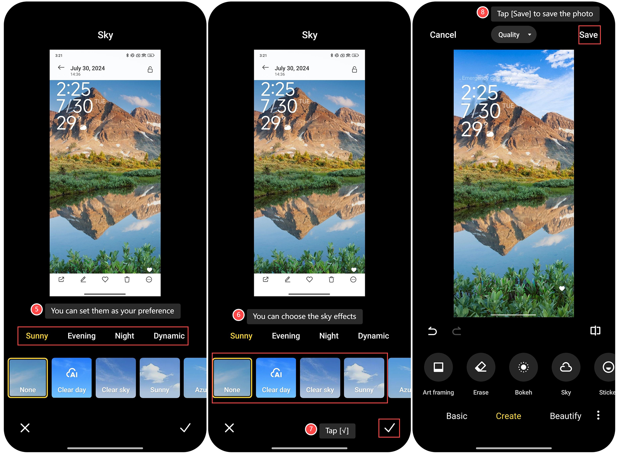 6. Anda dapat memilih efek langit dari opsi [Cerah]: [Tidak Ada], [Hari cerah AI], [Langit cerah], [Cerah], [Azure] atau [Berawan] dan sebagainya;