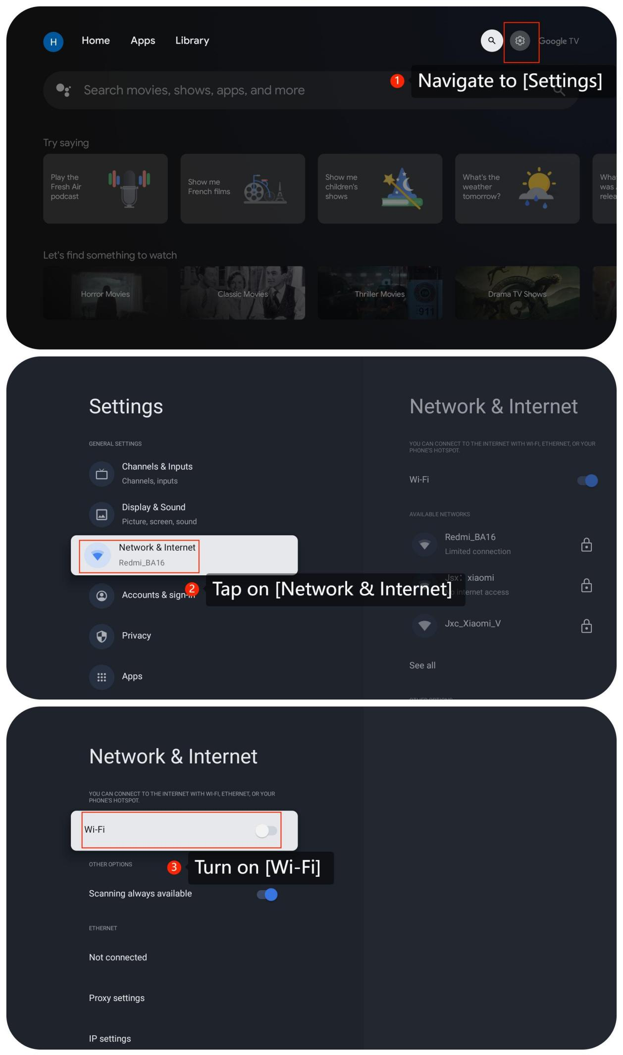 1. Pastikan TV terhubung ke internet. Anda dapat memeriksanya dengan masuk ke pengaturan dan memeriksa koneksi jaringan dengan membuka [Pengaturan] >>[ Jaringan & Internet] >> menghidupkan [Wi-Fi];