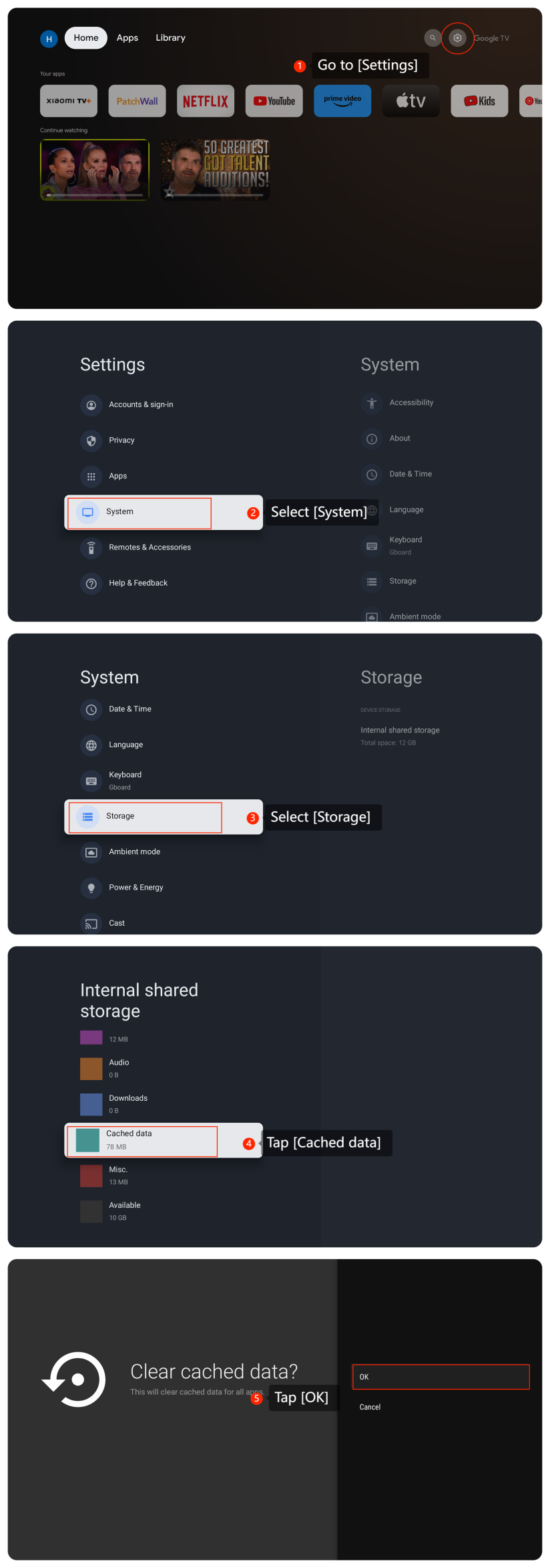 4. Jika Anda menggunakan web browser di TV, coba bersihkan cache dan data dengan membuka [Pengaturan] >> [Sistem] >>[ Penyimpanan] >> [Penyimpanan bersama internal] >> [Data cache] >> ketuk [OK];