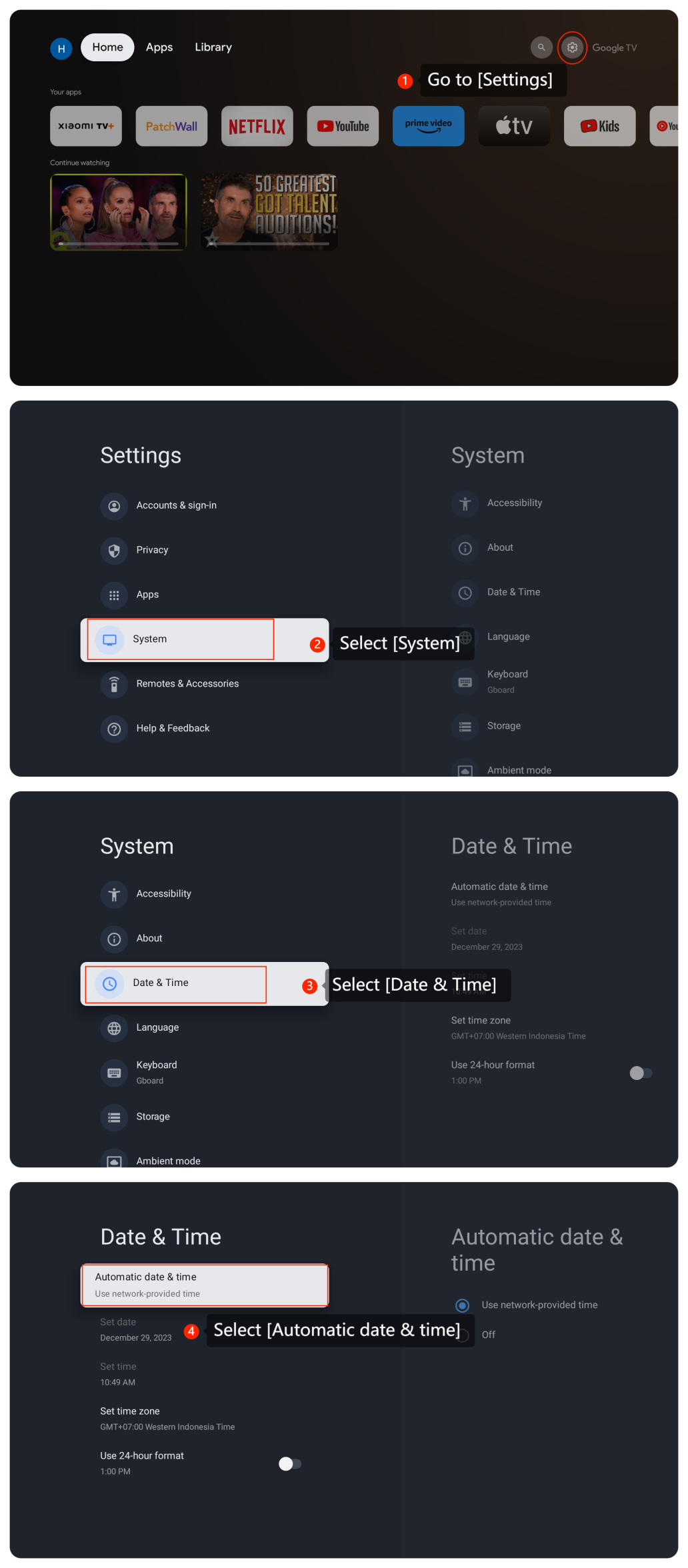 7. Pengaturan tanggal dan waktu yang salah terkadang dapat menyebabkan masalah dengan akses situs web. Jadi silakan verifikasi tanggal dan waktu di TV dengan membuka [Pengaturan] >> [Sistem] >> [Tanggal & Waktu] >> [Tanggal & waktu otomatis];