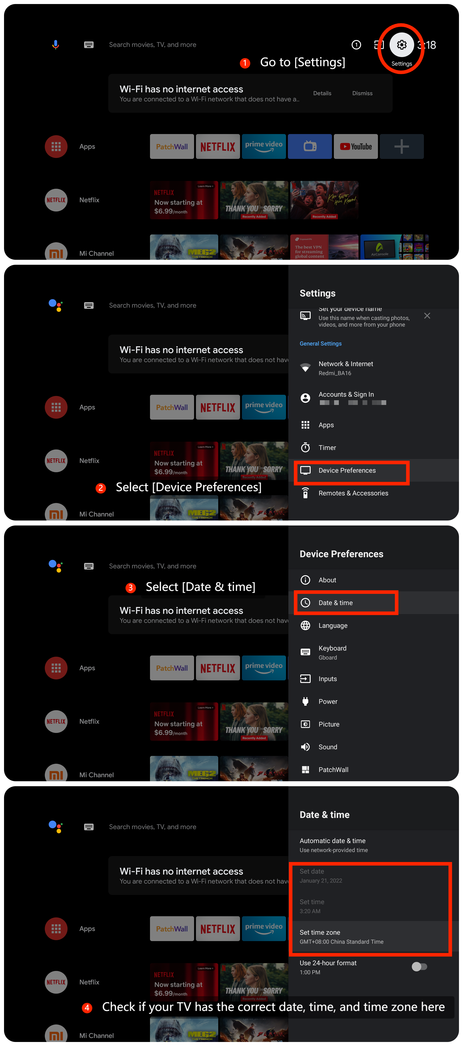 10. Pengaturan tanggal dan waktu yang salah terkadang dapat memengaruhi kemampuan untuk melakukan streaming konten. Pastikan TV Anda memiliki pengaturan tanggal, waktu, dan zona waktu yang benar dengan membuka [Pengaturan] >> [Preferensi Perangkat] >> [Tanggal & waktu] >> periksa apakah TV Anda memiliki tanggal, waktu, dan zona waktu yang benar;