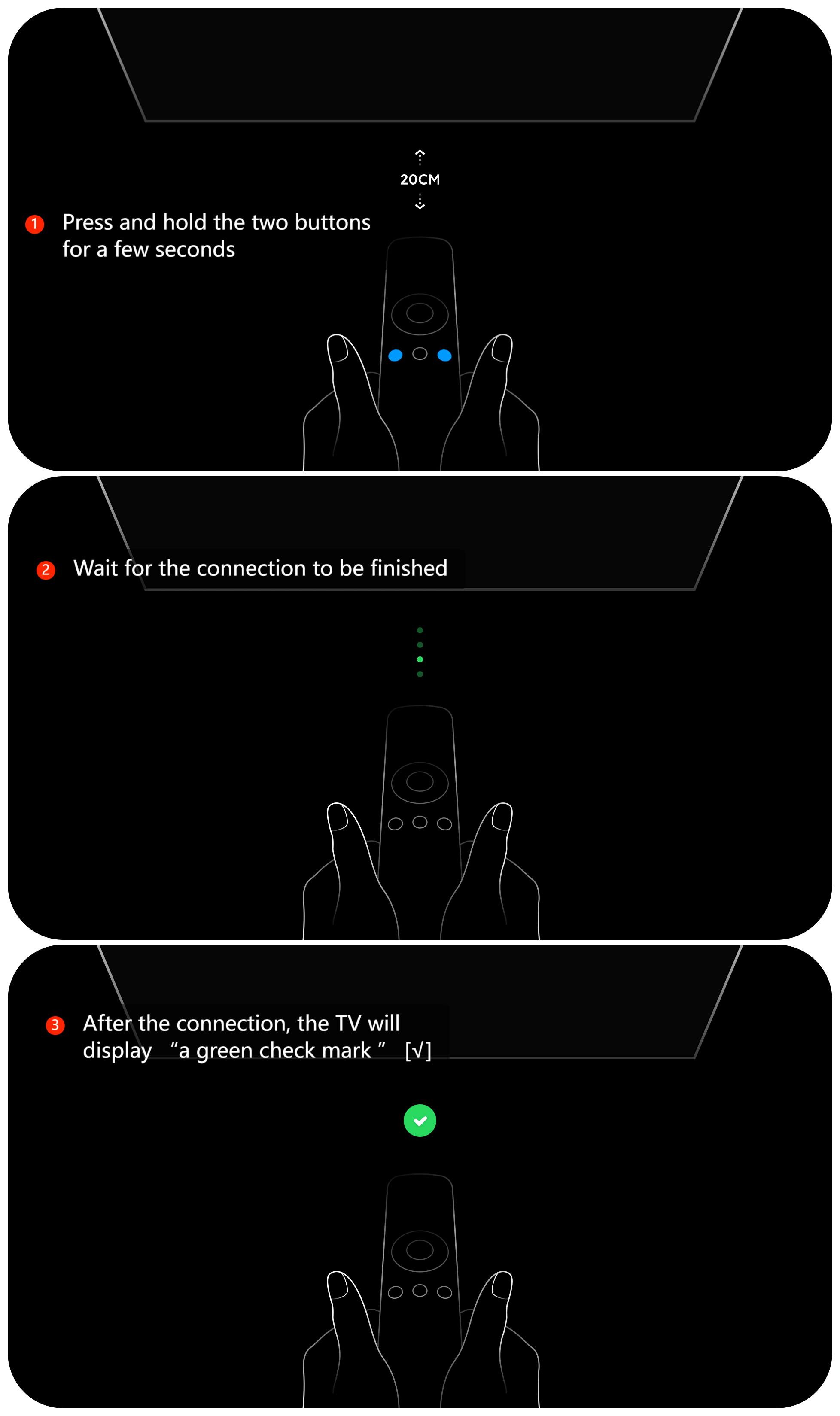 5. Pasangkan remote dengan menekan dan menahan tombol [Xiaomi TV+] dan [Home] secara bersamaan selama beberapa detik. Kemudian ikuti petunjuk di layar hingga layar menunjukkan tanda hijau, yang berarti prosesnya selesai.