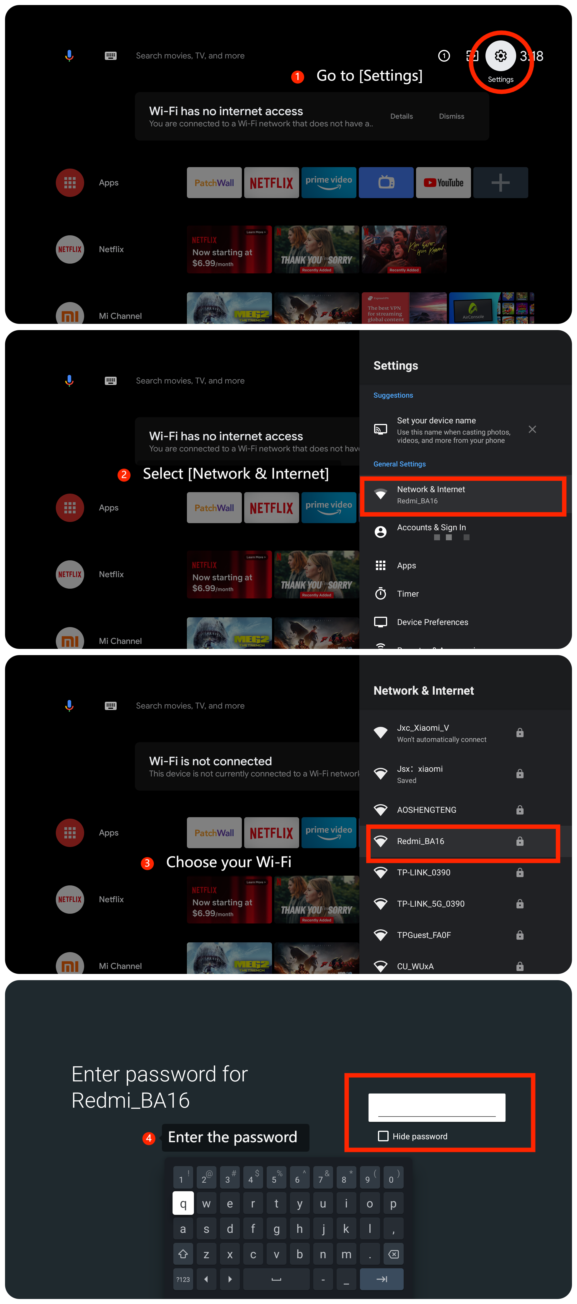 1. Sambungkan kembali ke jaringan Anda. Jika Anda menggunakan Wi-Fi, silakan buka [Pengaturan] >> [Jaringan & Internet] >> pilih jaringan Wi-Fi Anda dari daftar >>masukkan kata sandi dan konfirmasikan;