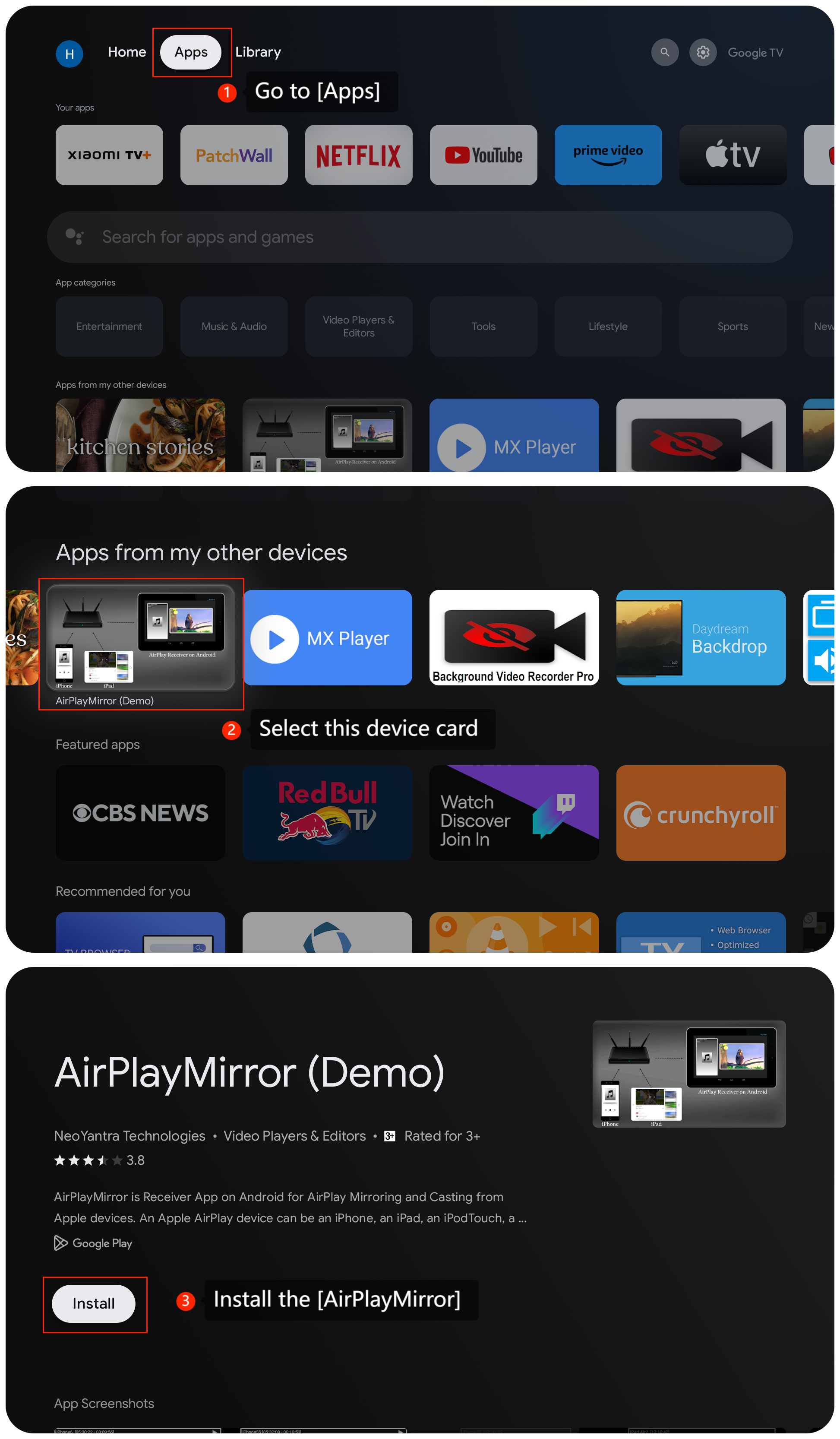 3. Konfirmasikan bahwa AirPlay diaktifkan di Xiaomi Google TV Anda. Arahkan ke menu pengaturan dan periksa opsi apa pun yang terkait dengan AirPlay atau pencerminan layar. Pastikan tombol diaktifkan dengan membuka [Aplikasi] >> [AirPlayMirror].