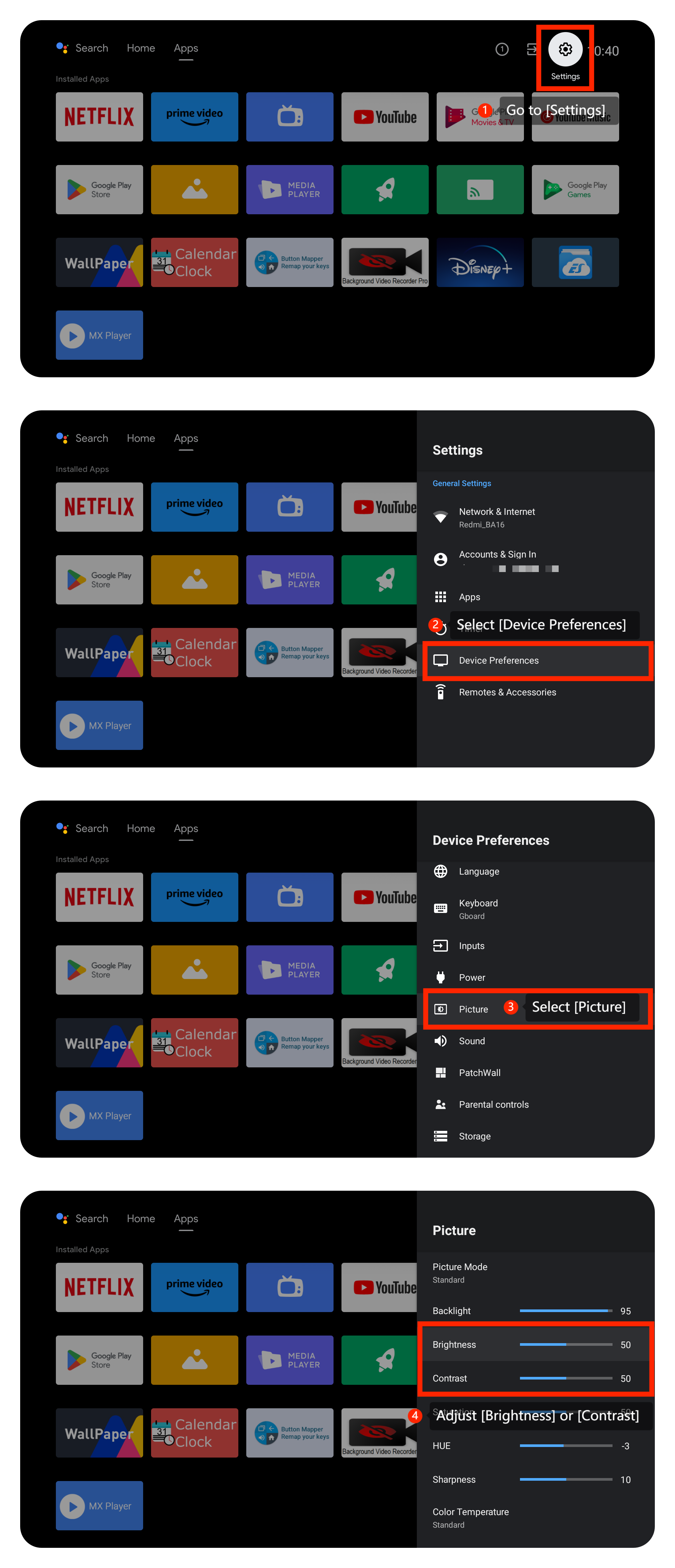 5. Periksa pengaturan TV dengan membuka [Pengaturan] >> [Preferensi Perangkat] >> [Gambar] >> menyesuaikan [Kecerahan] atau [Kontras];