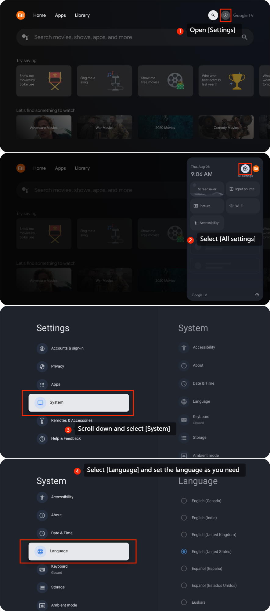 Xiaomi TV A 55 2025 memungkinkan Anda memilih dan mengubah bahasa tampilan sistem sesuai dengan preferensi Anda. Anda dapat memilih bahasa antarmuka yang berbedasehingga semua menu, pengaturan, antarmuka aplikasi, dll. TV ditampilkan dalam bahasa yang dipilih. TV akan merekomendasikan konten dalam bahasa yang sesuai sesuai dengan bahasa yang dipilih, termasuk film, serial TV, aplikasi, dll., untuk memastikan bahwa Anda mendapatkan konten yang lebih sesuai dengan kebiasaan bahasa Anda. Sementara itu, Asisten Googlejuga akan berinteraksi dalam bahasa yang dipilih. Anda dapat mengeluarkan perintah suara dalam bahasa ibu Anda, yang lebih intuitif dan nyaman.