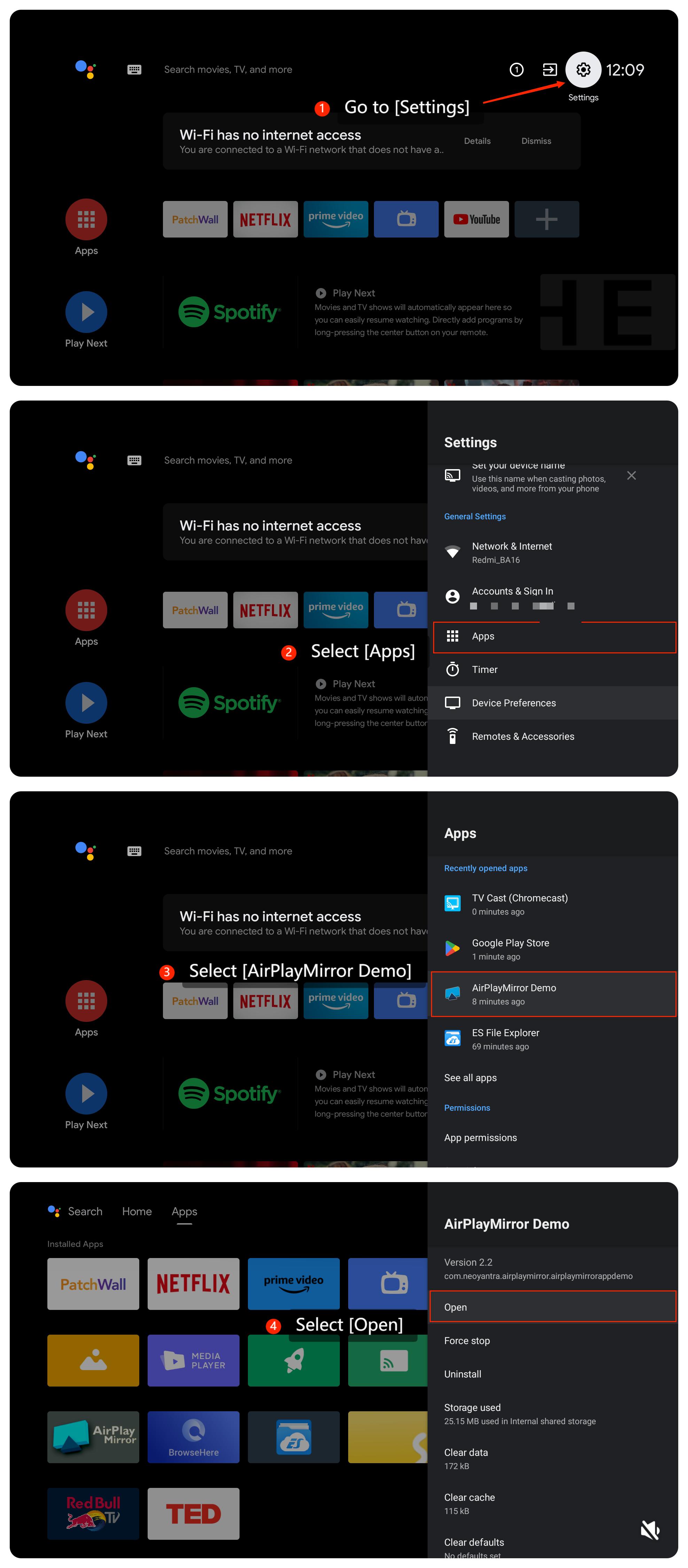 2.Pastikan AirPlay diaktifkan di TV dengan membuka [Pengaturan] >> [Aplikasi] >> [AirPlay] >> [Buka];