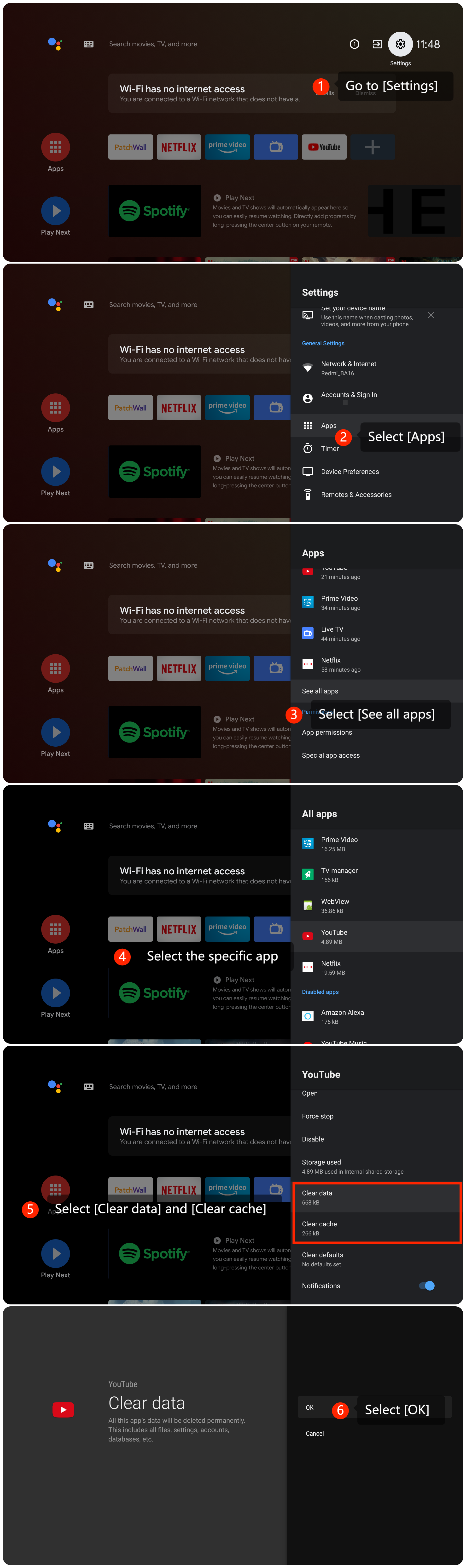 2. Anda dapat menghapus cache dan data aplikasi dengan menavigasi ke [Pengaturan] >>[Aplikasi] >>[Lihat semua pps] >> memilih aplikasi tertentu >>[Hapus data] dan [Hapus cache]>> [OK];