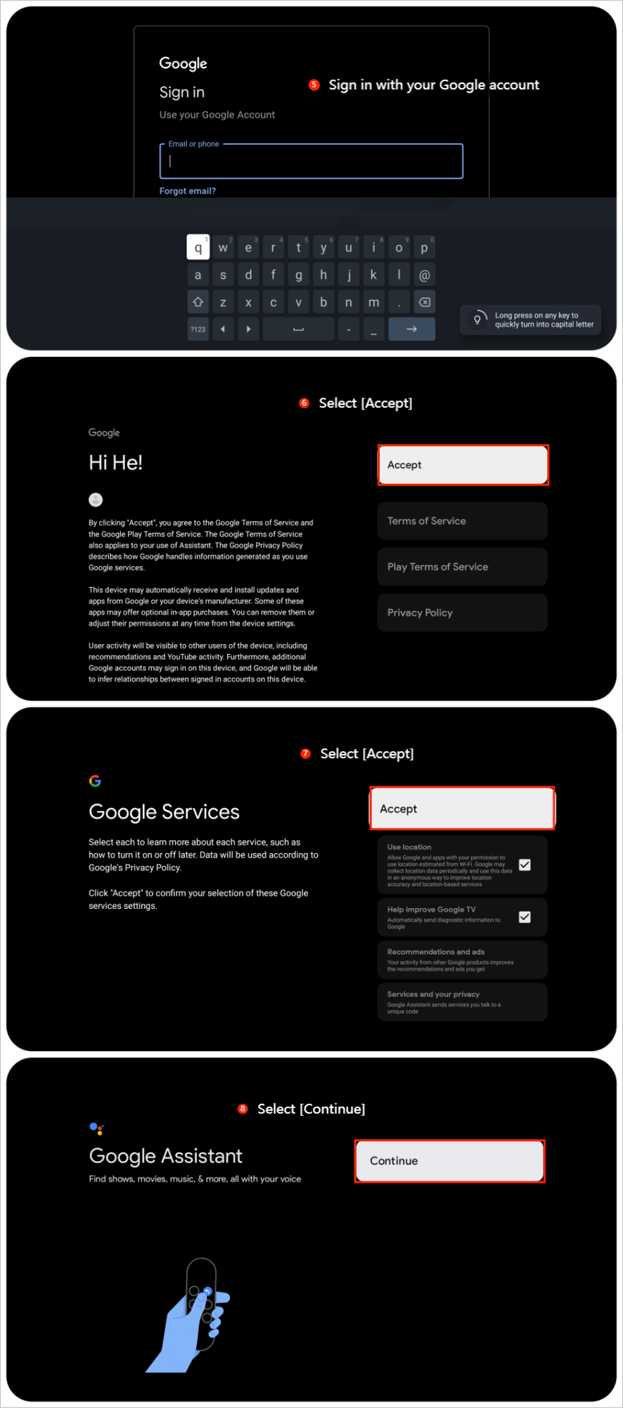5. Untuk mengakses layanan Google dan mempersonalisasi pengalaman Anda, masuk dengan akun Google Anda; 6. Pilih [Terima]; 7. Pilih [Terima]; 8. Pilih [Lanjutkan];