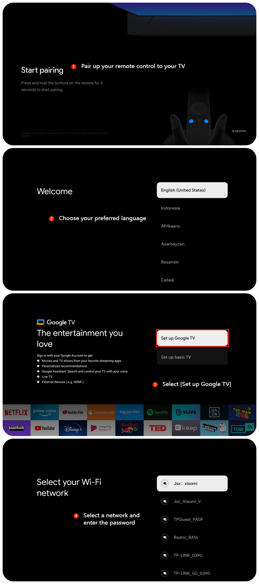 Untuk menyiapkan TV, silakan lihat langkah-langkah berikut: 1. Pasangkan remote control Anda ke TV Anda; 2. Pilih bahasa pilihan Anda; 3. Pilih [Siapkan Google TV]; 4. Anda harus menghubungkan TV ke jaringan Wi-Fi. Pilih jaringan Anda dari daftar, masukkan kata sandi jika diminta, dan sambungkan;