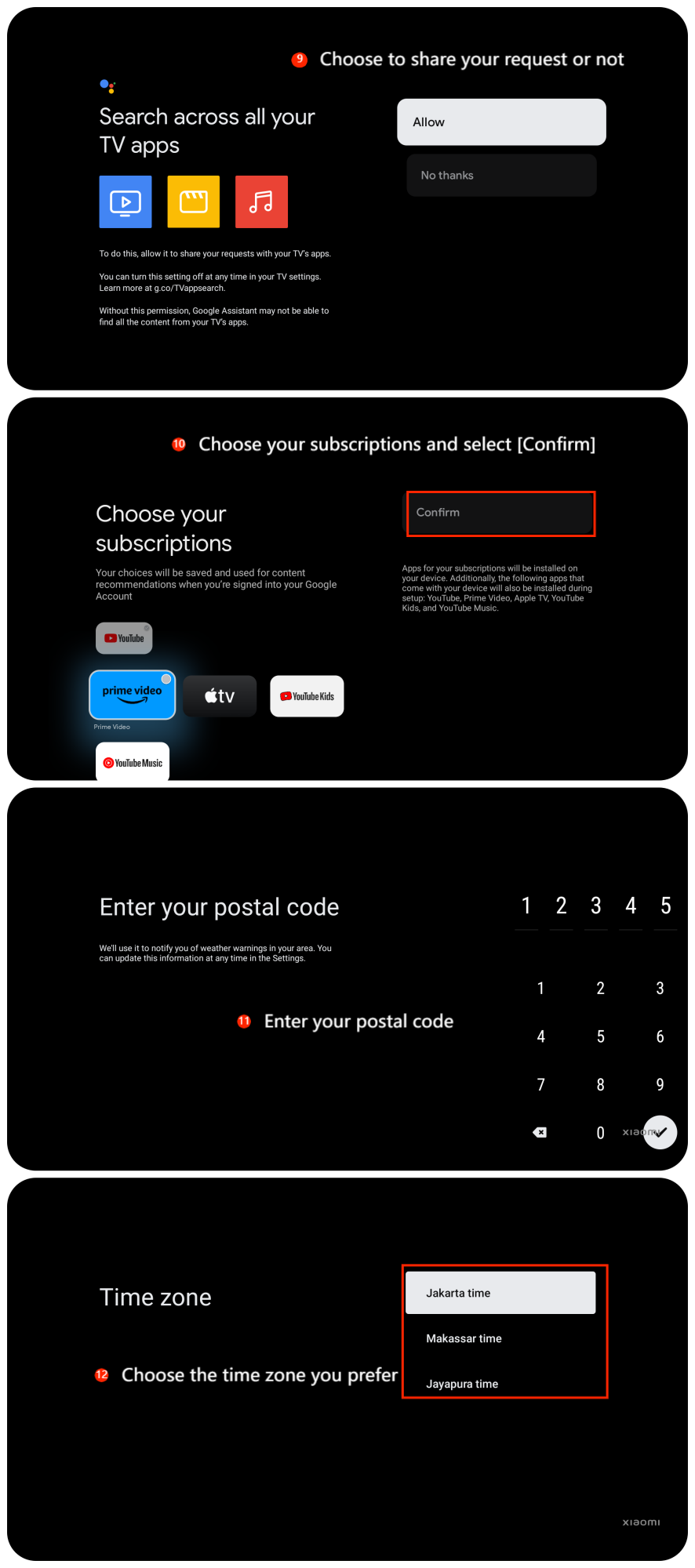 9. Pilih untuk membagikan permintaan Anda dengan APP TV Anda atau tidak; 10. Pilih langganan Andadan pilih [Konfirmasi]; 11. Masukkan kode pos Anda; 12. Pilih zona waktu yang Anda sukai;