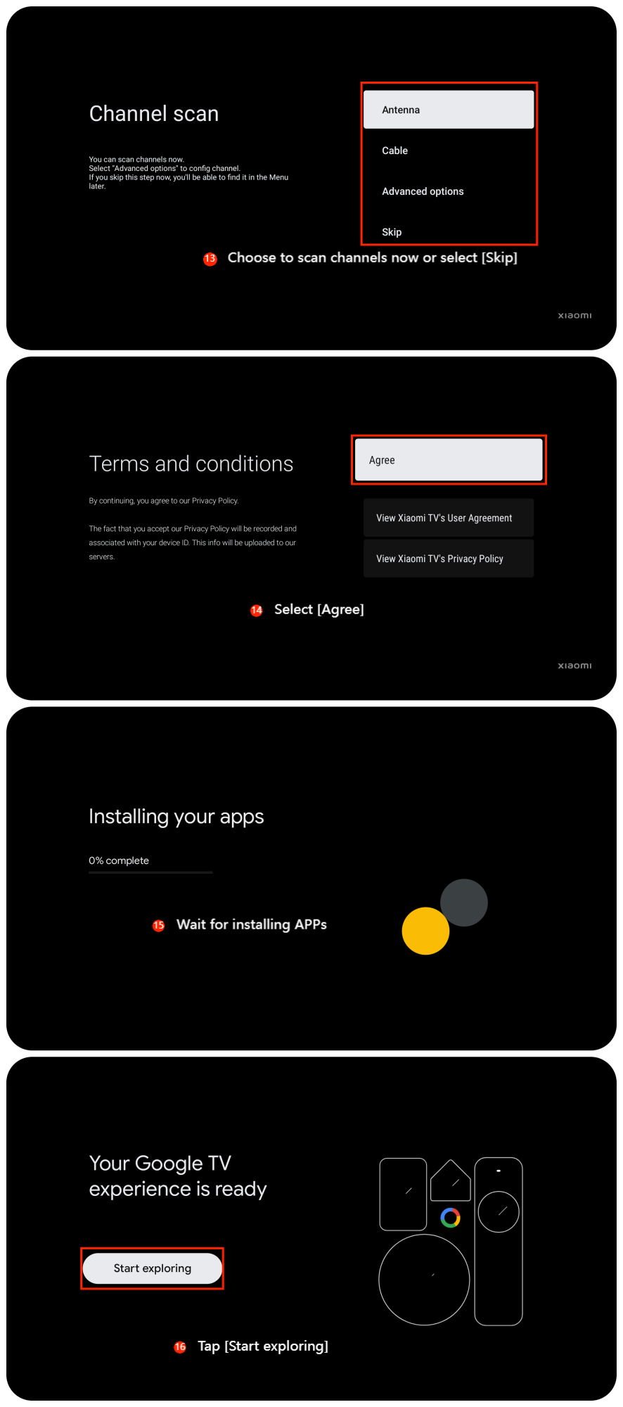 13. Pilih untuk memindai saluran sekarang atau pilih [Lewati]; 14. Pilih [Setuju]; 15. Tunggu untuk menginstal APLIKASI; 16. Ketuk [Mulai menjelajahi], penyiapan Anda selesai.
