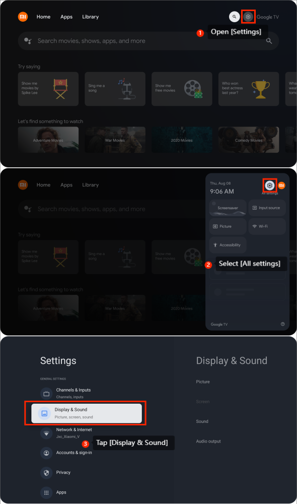 Kecerahan dan kontras padaXiaomi TV A 65 2025adalahpengaturan gambar dasar yang secara langsung memengaruhi tampilan gambar.Menyesuaikan pengaturan ini memungkinkan Anda untuk mempersonalisasi pengalaman menonton berdasarkan preferensi pribadi dan kondisi lingkungan. 1. Kecerahan: Kecerahanmengontrol kecerahan atau kegelapan gambar secara keseluruhan. Meningkatkan kecerahan membuat gambar lebih cerah dan lebih terlihat, sementara menurunkannya akan menggelapkan gambar. Untuk menyesuaikan kecerahan TV Anda dengan benar, silakan lihatlangkah-langkah berikut: (1).Buka [Pengaturan]; (2). Pilih [Semua pengaturan]; (3). Ketuk [Tampilan & Suara];