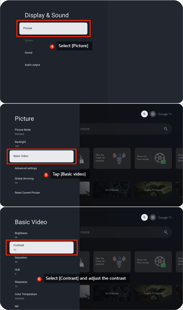 (4). Pilih [Gambar]; (5). Ketuk [Video dasar]; (6). Pilih [Contrast] dan sesuaikan kontras. Nota: Pengaturan kontras yang ekstrem dapat mengakibatkan hilangnya detail di area terang atau gelap gambar. Jadi harap sesuaikan kontras yang tepat sesuai dengan kebiasaan menonton Anda, jarak dari televisi, dan kecerahan di lingkungan tertentu.