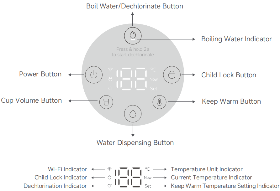 Ada Tombol Rebus Air/Deklorinat, Tombol Daya, Tombol Volume Cangkir, Tombol Pengeluaran Air, Tombol Tetap Hangat, Tombol Kunci Anak, Indikator Air Mendidih, Indikator Wi-Fi, Indikator Kunci Anak, Indikator Deklorinasi, Indikator Unit Suhu, Indikator Suhu Saat Ini dan Indikator Pengaturan Suhu Tetap Hangat.