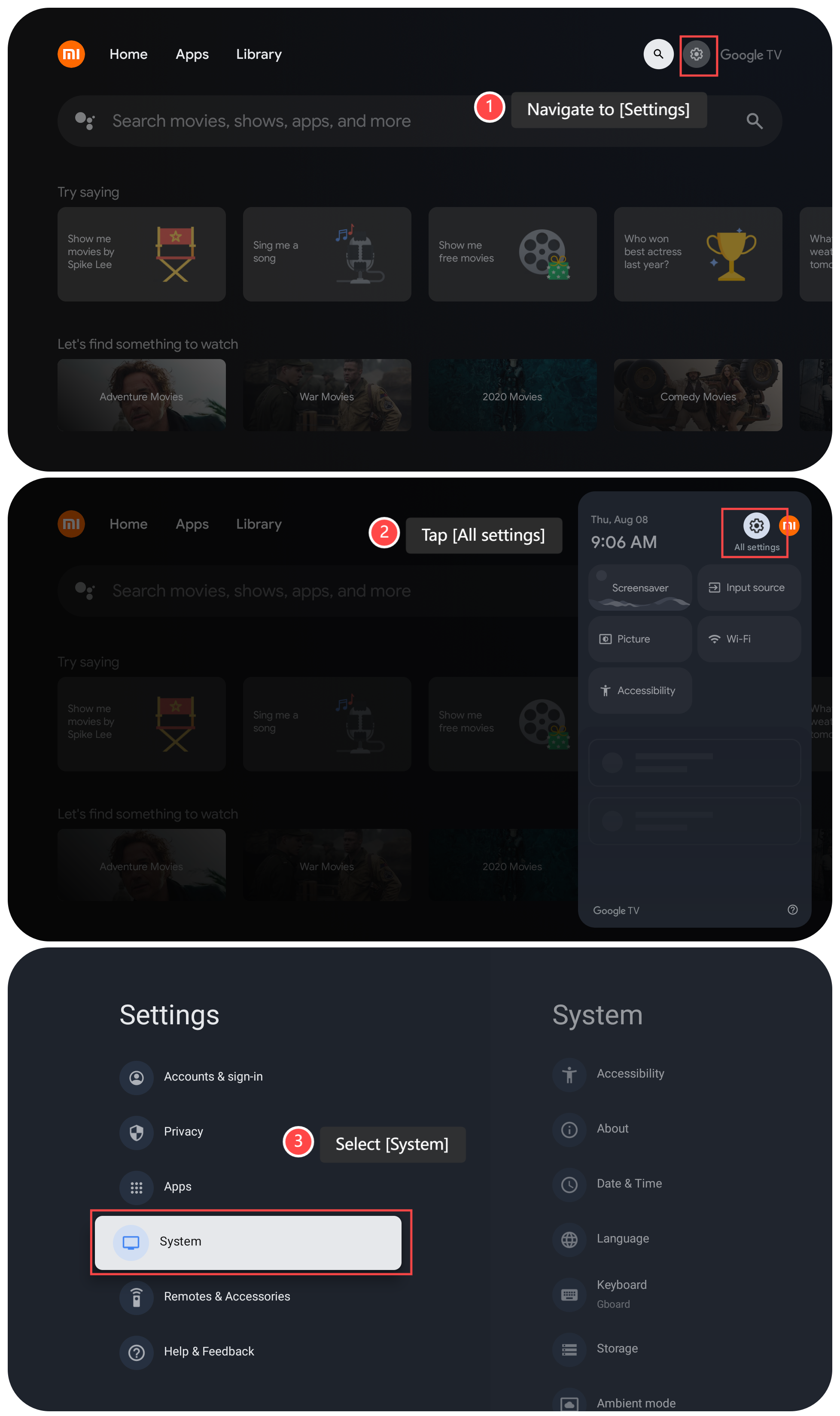Untuk referensi Anda, harap aktifkan tanggal & waktu otomatis di TV Anda sebagai berikut: