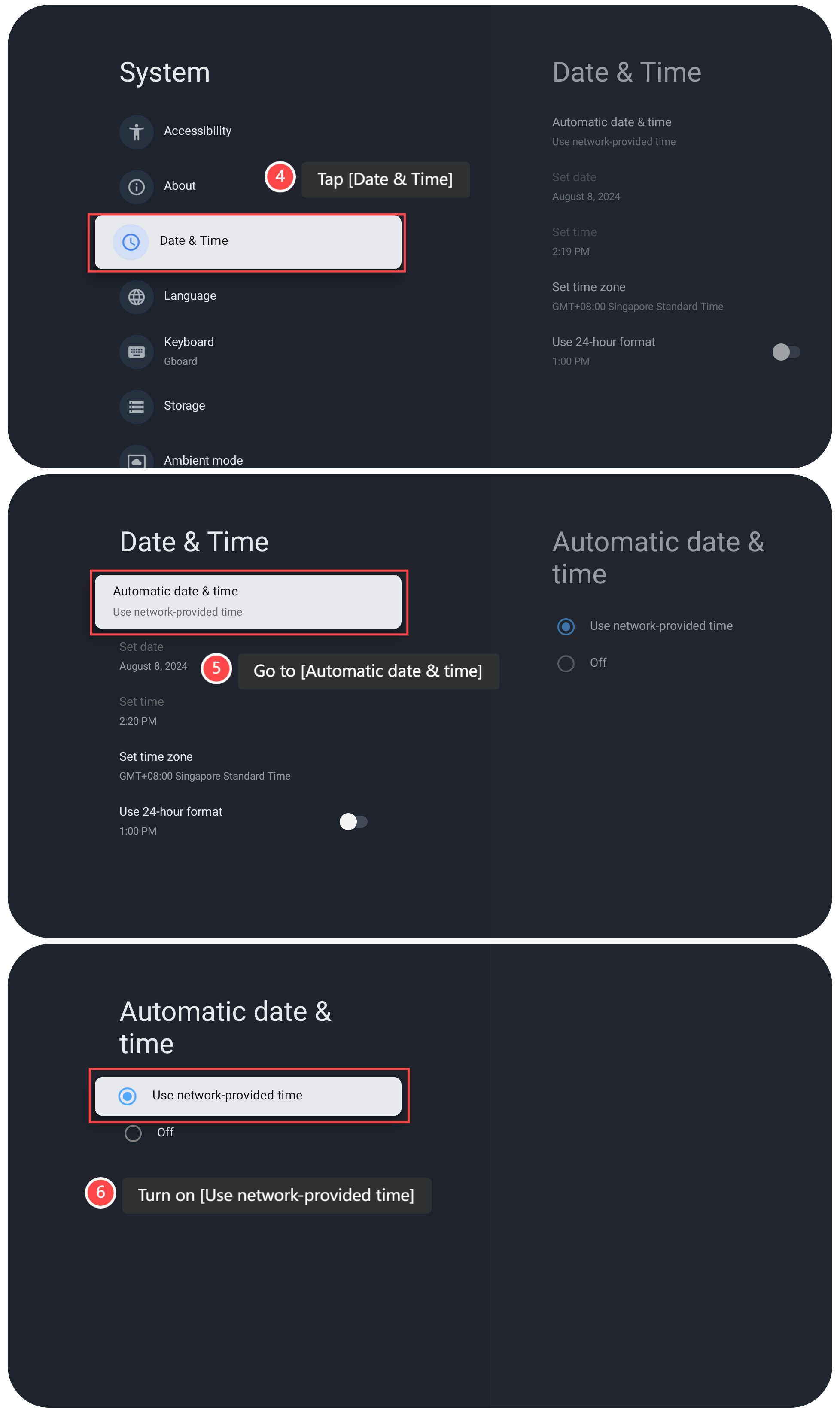 Untuk referensi Anda, harap aktifkan tanggal & waktu otomatis di TV Anda sebagai berikut:
