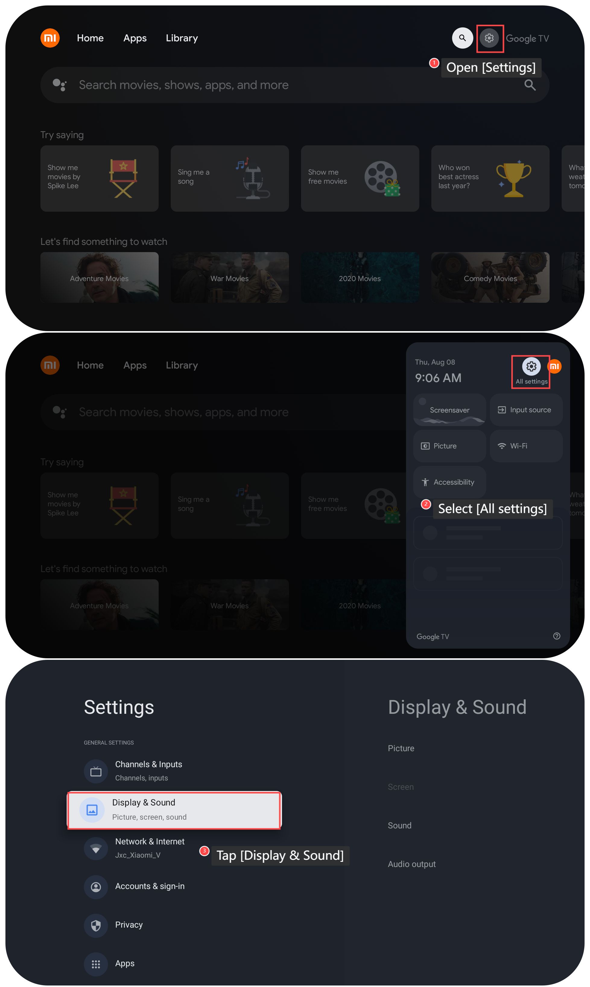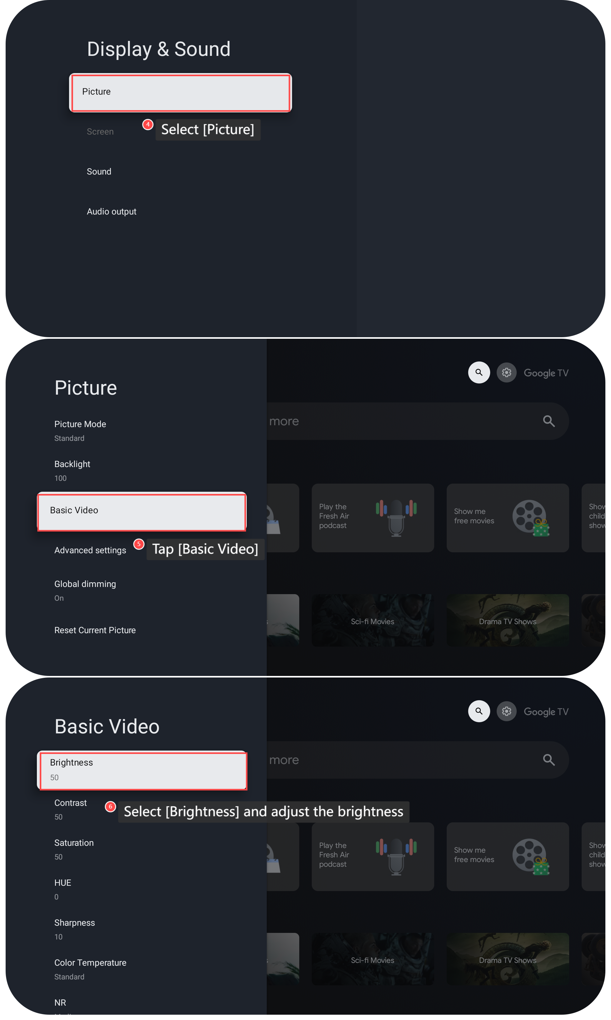 Kecerahan dan kontras padaXiaomi TV A 43 2025adalahpengaturan gambar dasar yang secara langsung memengaruhi tampilan gambar.Menyesuaikan pengaturan ini memungkinkan Anda untuk mempersonalisasi pengalaman menonton berdasarkan preferensi pribadi dan kondisi lingkungan. 1. Kecerahan: Kecerahanmengontrol kecerahan atau kegelapan gambar secara keseluruhan. Meningkatkan kecerahan membuat gambar lebih cerah dan lebih terlihat,sementara menurunkannya menggelapkan gambar. Untuk menyesuaikan kecerahan TV Anda dengan benar, silakan lihatlangkah-langkah berikut: (1).Buka [Pengaturan]; (2). Pilih [Semua pengaturan]; (3). Ketuk [Tampilan & Suara]; (4). Pilih [Gambar]; (5). Ketuk [Video Dasar]; (6). Pilih [Kecerahan] dan sesuaikan kecerahan.