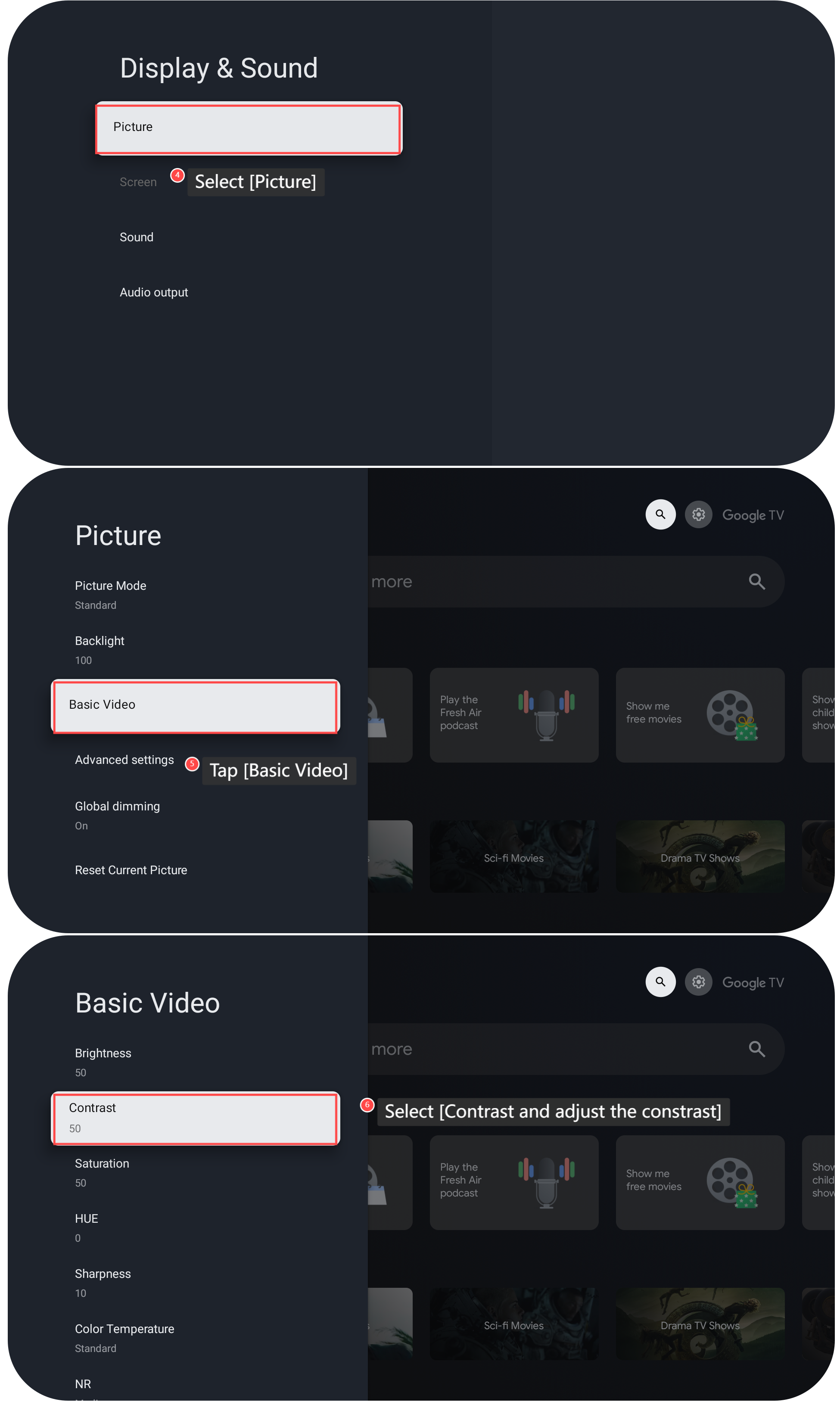 2. Kontras: Kontras mengontrol perbedaan antara bagian gambar yang paling terang dan paling gelap. Meningkatkan kontras membuat area terang lebih cerah dan area gelap lebih gelap, meningkatkan kejelasan dan kedalaman secara keseluruhan. Pengaturan kontras yang tepat dapat membuat gambar tampak lebih hidup dan nyata. Untuk menyesuaikan contrast di TV Anda dengan benar, silakan lihatlangkah-langkah berikut: (1).Buka [Pengaturan]; (2). Pilih [Semua pengaturan]; (3). Ketuk [Tampilan & Suara]; (4). Pilih [Gambar]; (5). Ketuk [Video dasar]; (6). Pilih [Contrast] dan sesuaikan kontras. Nota: Pengaturan kontras yang ekstrem dapat mengakibatkan hilangnya detail di area terang atau gelap gambar. Jadi harap sesuaikan kontras yang tepat sesuai dengan kebiasaan menonton Anda, jarak dari televisi, dan kecerahan di lingkungan tertentu.