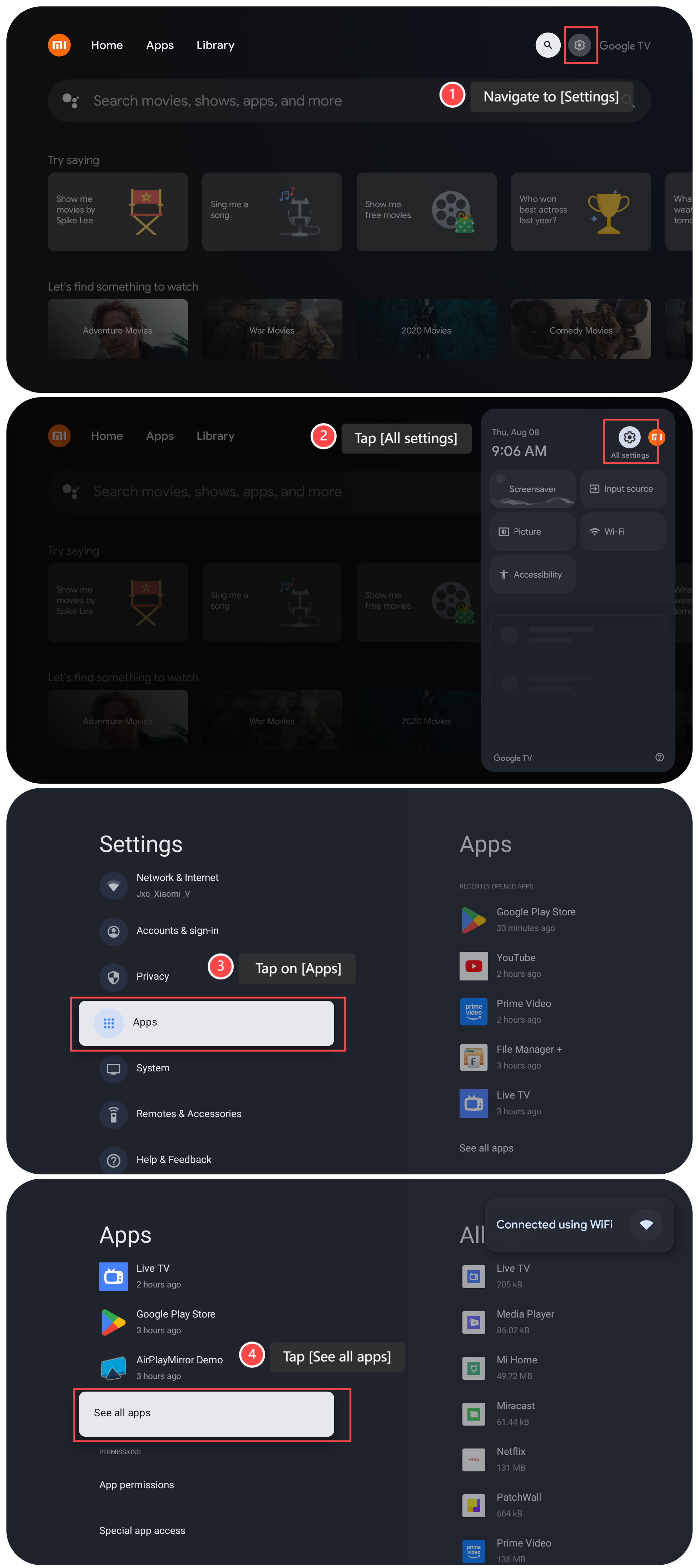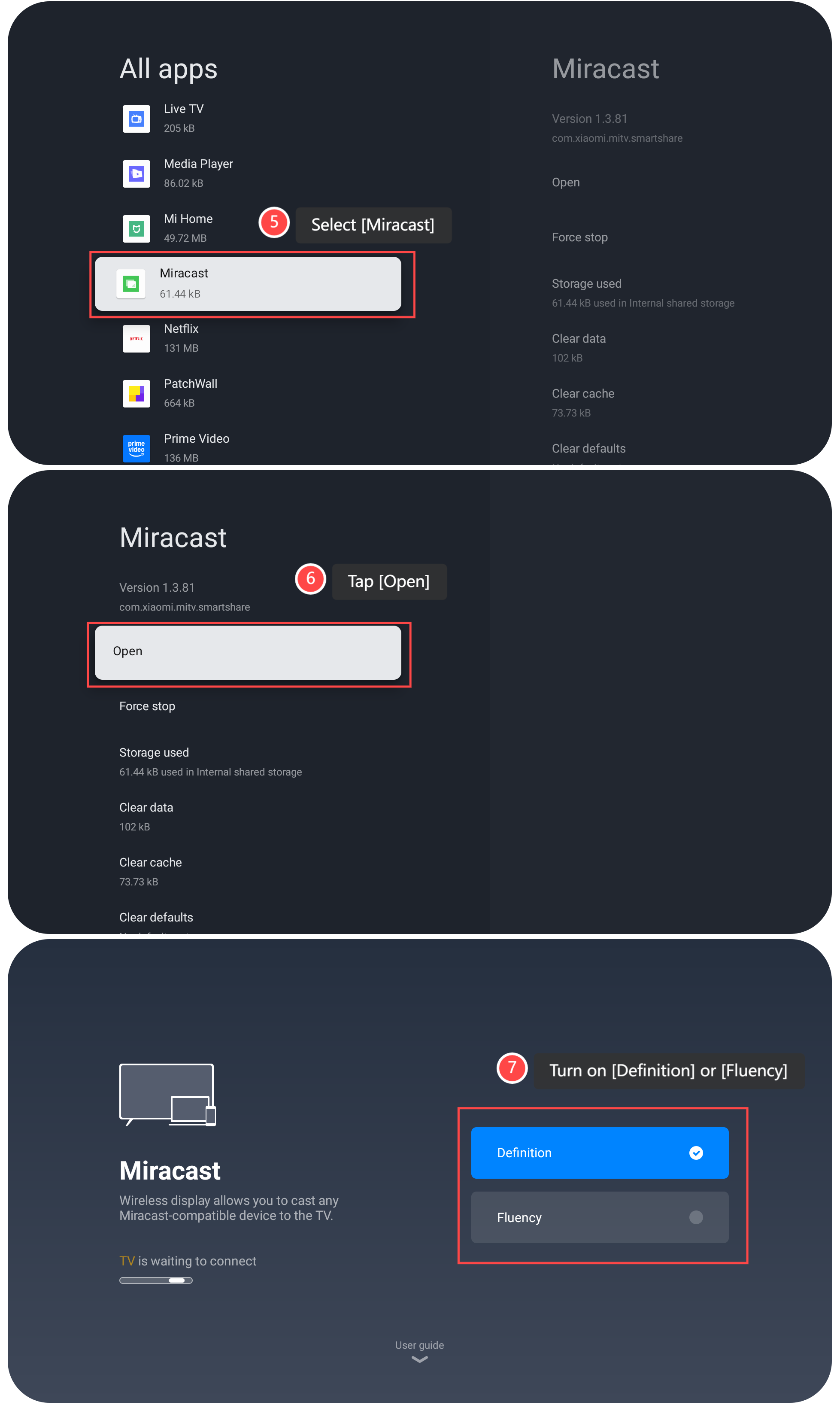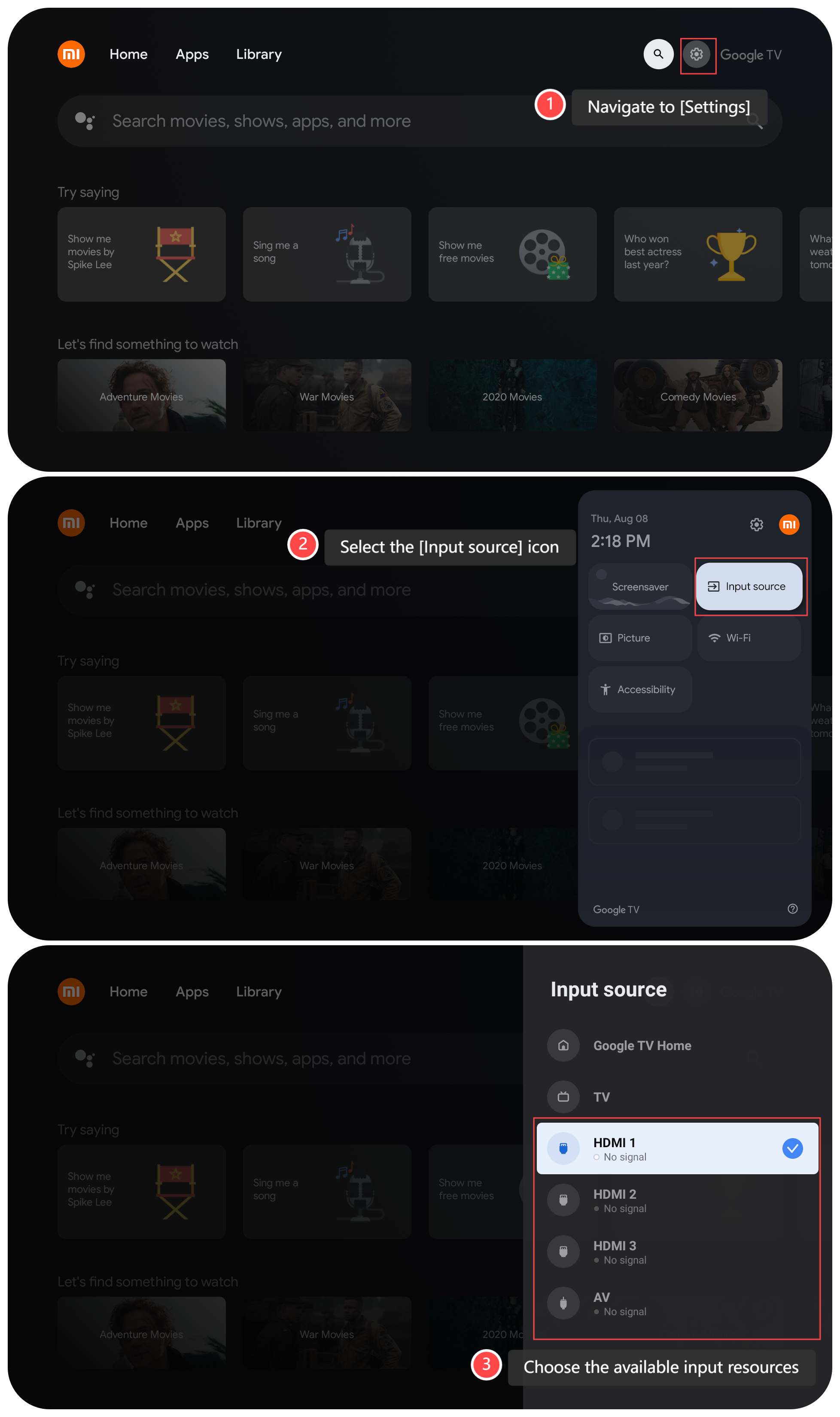Anda dapat menggunakan fitur menghubungkan monitor eksternal atau Miracast untuk menjadikan Xiaomi TV A Pro 43 2025 sebagai layar gaming atau proyektor.Saat digunakan untuk bermain game, ia menawarkan layar resolusi tinggi yang besar, mengurangi input lag, dan meningkatkan pengalaman keseluruhan dengan efek suara premium. Sebagai proyektor, TV mendukung proyeksi nirkabel, memungkinkan berbagi konten yang mudah tanpa koneksi fisik. Sebagai referensi Anda, berikut adalah dua metode untuk melakukannya: Metode 1: 1. Hubungkan port output video komputer atau konsol game Anda dengan kabel seperti HDMI, ke port input video TV. Pastikan Anda menggunakan kabel berkualitas tinggi dan terhubung dengan benar ke kedua perangkat Anda. Arahkan ke [Pengaturan]; 2. Pilih ikon [Inputsource] dan alihkan sumber sinyal ke saluran HDMI; 3. Pilih sumber daya input yang tersedia. Nota: Dalam beberapa kasus, Anda perlu menyesuaikan pengaturan tampilan di konsol game agar sesuai dengan resolusi TV Anda. Ini dapat ditemukan di menu pengaturan konsol. Metode 2: 1. Arahkan ke [Pengaturan]; 2. Ketuk [Semua pengaturan]; 3. Ketuk [Aplikasi]; 4.Kemudianketuk [Lihat semua aplikasi]; 5. Pilih [Miracast]; 6. Ketuk [Buka]; 7.Nyalakan [Definisi] atau[Kefasihan]; 8. Gunakan perangkat dengan fitur bawaan Miracast seperti ponsel cerdas atau tablet Anda untuk mentransmisikan layar.