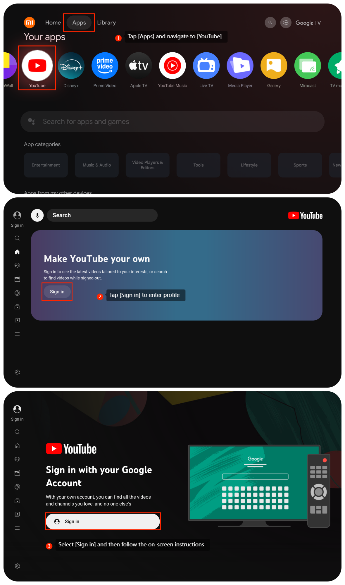 Untuk masuk ke APP atau akun di TV, seperti YouTube, silakan lihat langkah-langkah berikut: