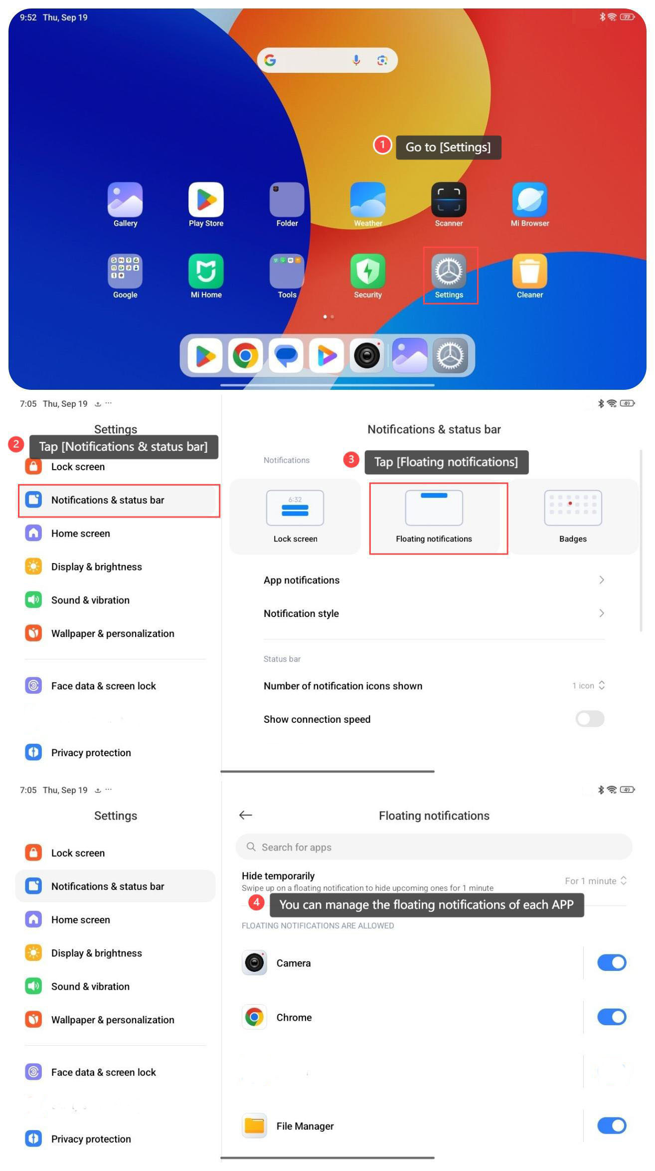 Untuk mengelola notifikasi mengambang di tablet Anda, lihat langkah-langkah berikut: