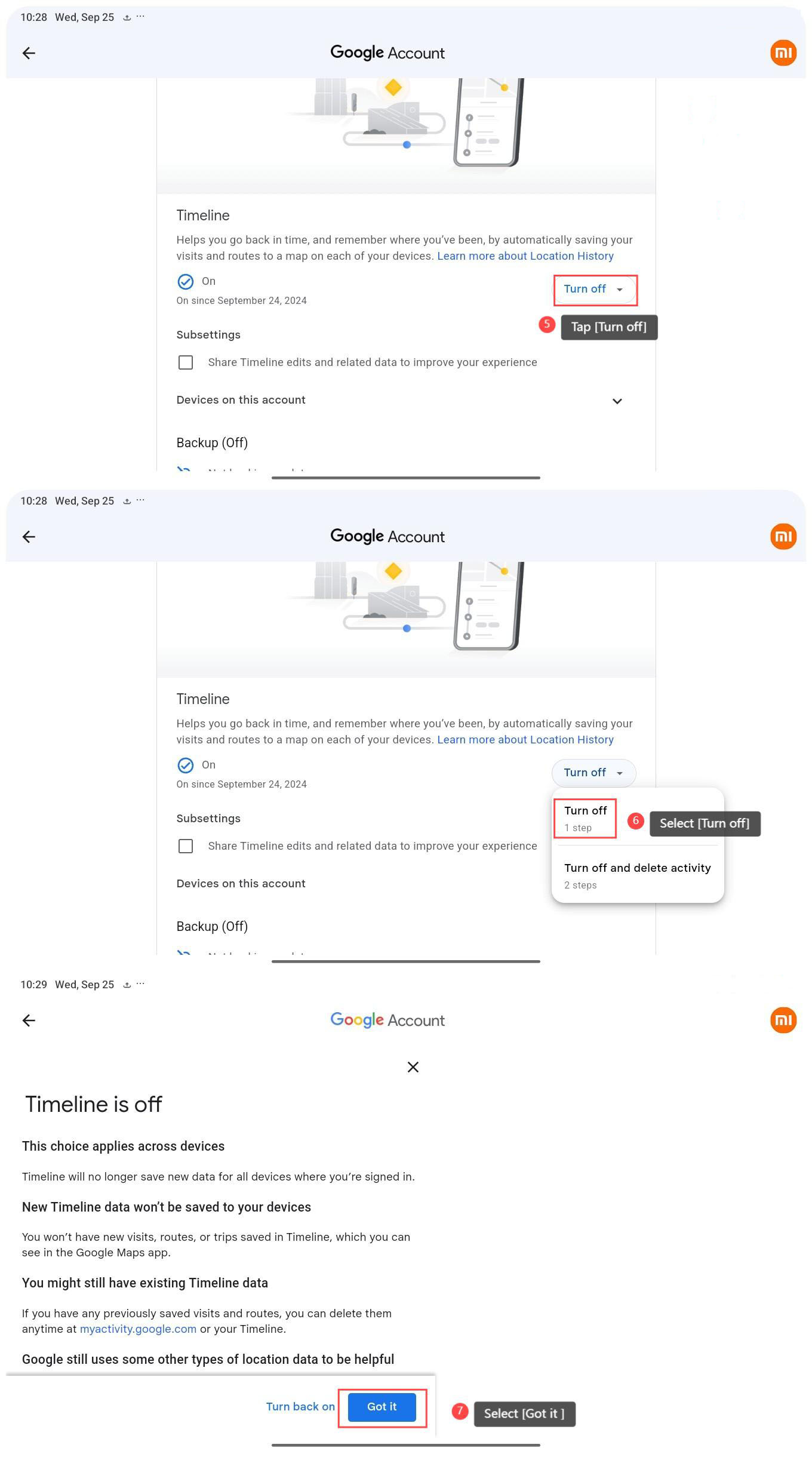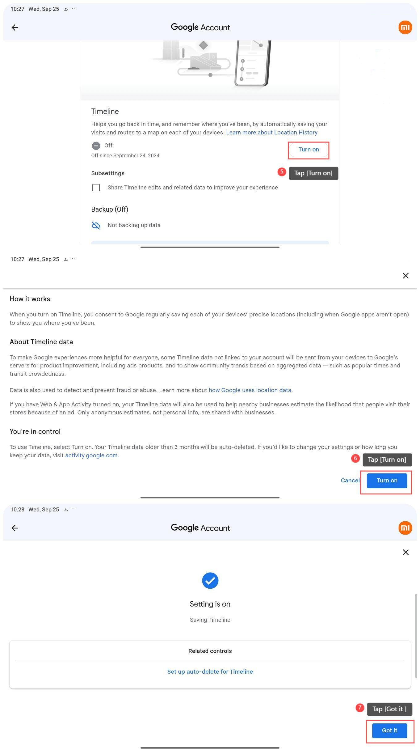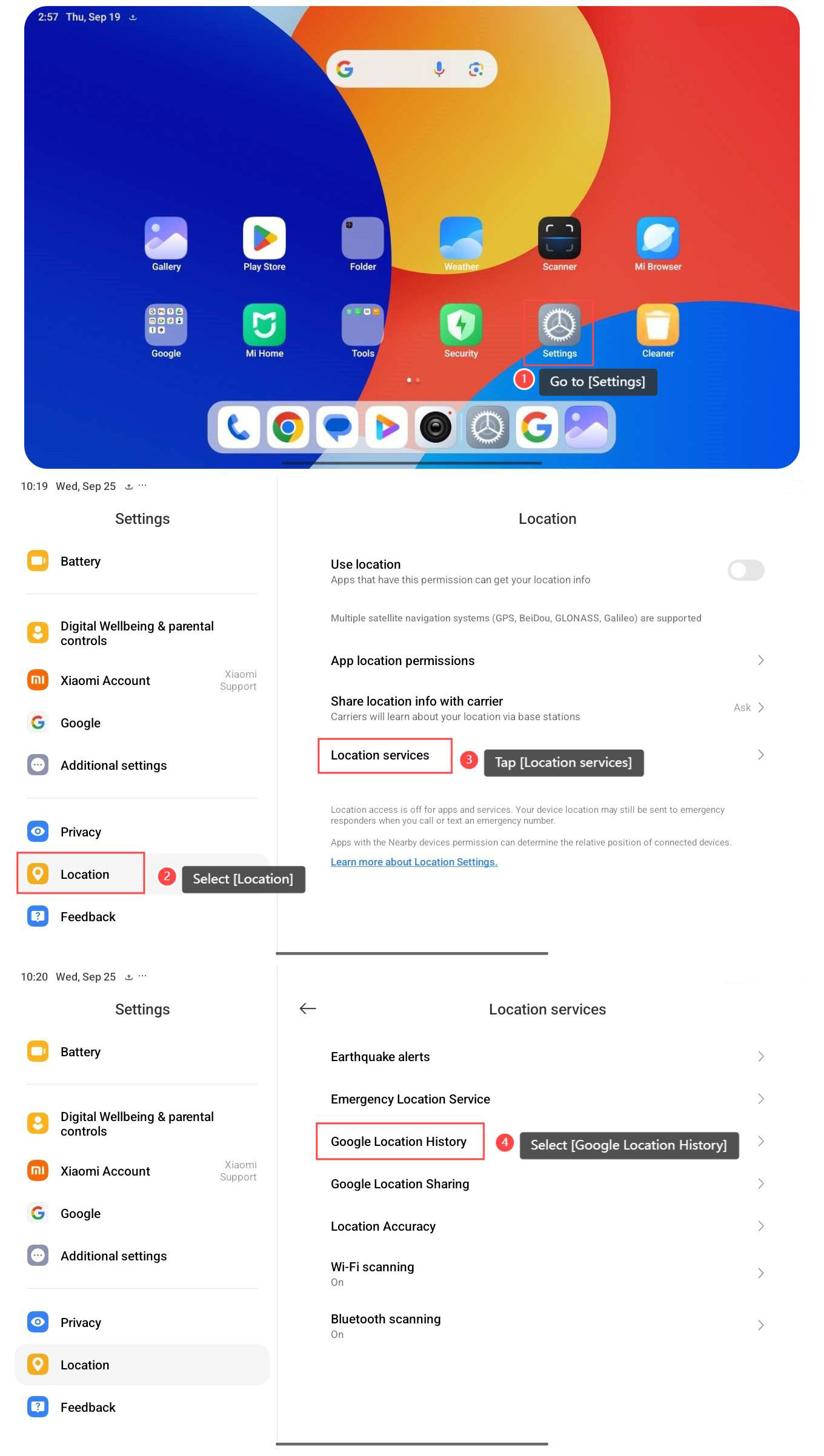 Riwayat Lokasi pada REDMI Pad SE 8.7 4G adalah fitur yang merekam dan melacak lokasi geografis perangkat dari waktu ke waktu. Anda dapat mengelola fitur ini melalui pengaturan perangkat, tempat Anda memilih untuk mengaktifkan atau menonaktifkan pelacakan lokasi berdasarkan preferensi privasi dan fungsionalitas Anda. Untuk menonaktifkan Histori Lokasi, lihat langkah-langkah berikut: 1. Buka [Pengaturan]; 2. Pilih [Lokasi]; 3. Ketuk [Layanan lokasi]; 4. Pilih [Riwayat Lokasi Google]; 5. Ketuk [Matikan]; 6. Pilih [Matikan]; 7. Pilih [Mengerti ]. Untuk mengaktifkan Histori Lokasi, lihat langkah-langkah berikut: 1. Buka [Pengaturan]; 2. Pilih [Lokasi]; 3. Ketuk [Layanan lokasi]; 4. Pilih [Riwayat Lokasi Google]; 5. Ketuk [Nyalakan]; 6. Ketuk [Nyalakan]; 7. Ketuk [Mengerti]. Nota: 1. Jika Anda mengaktifkan Riwayat Lokasi, pelacakan terus menerus dapat menyebabkan akses tidak sah atau pemantauan pergerakan pribadi; 2. Jika Anda menonaktifkan Riwayat Lokasi, layanan dan aplikasi berbasis lokasi tidak akan berfungsi secara efektif tanpa data lokasi.