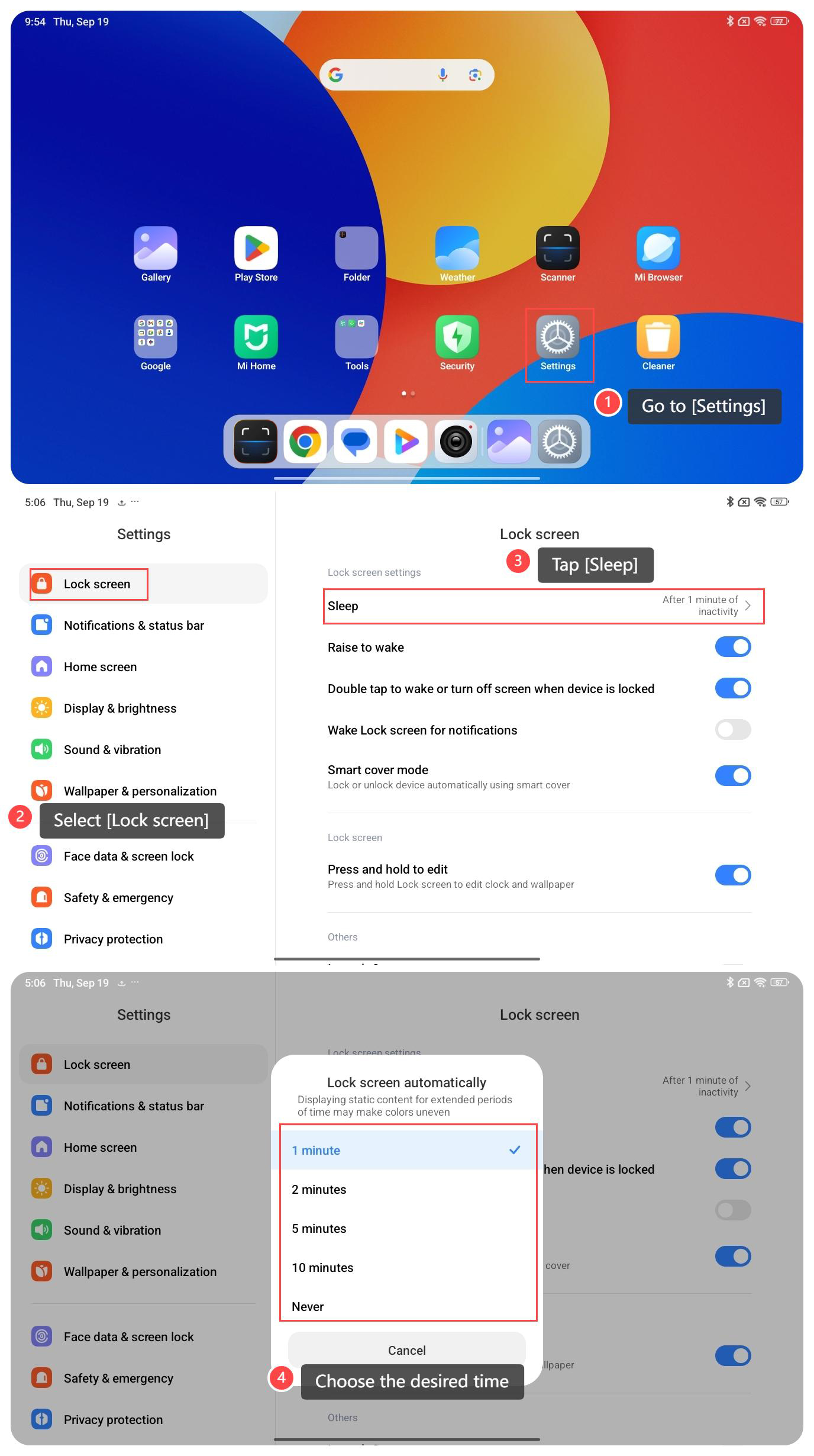 Fungsi pengaturan waktu tidur menghemat daya, melindungi layar, dan meningkatkan privasi dengan mematikan layar secara otomatis. Anda dapat menyesuaikan waktu idle sesuai kebutuhan untuk mengoptimalkan kinerja perangkat dan masa pakai baterai.