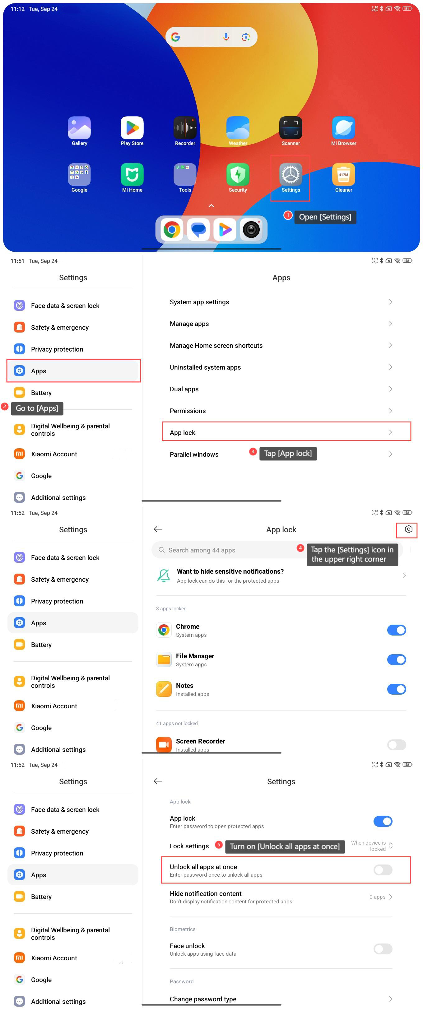 Untuk membuka kunci semua aplikasi dengan memasukkan kata sandi kunci aplikasi sekali di Redmi Pad SE 8.7 4G, silakan lihat langkah-langkah berikut: