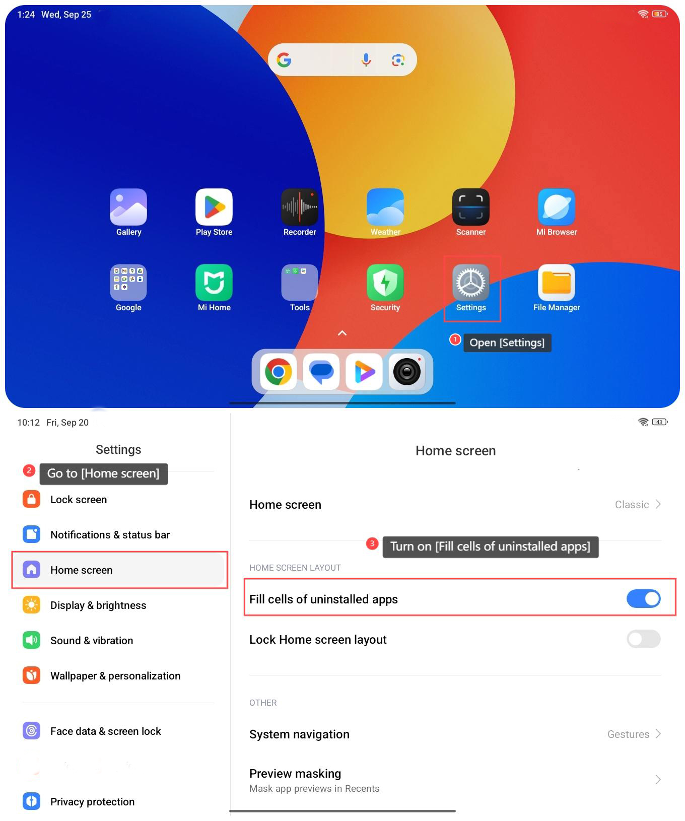 Pada Redmi Pad SE 8.7, ikon aplikasi akan dihapus seluruhnya setelah dihapus. Anda juga dapat mengaktifkan opsi di pengaturan untuk mengisi tata letak secara otomatis. Mengisi ruang kosong dapat mempertahankan tampilan yang rapi dan konsisten di layar beranda, mencegah celah yang dapat membuat antarmuka terlihat berantakan. Konsistensi visual ini memungkinkan Anda mengidentifikasi aplikasi yang tersedia dengan cepat tanpa perlu mengatur ulang ikon secara manual.