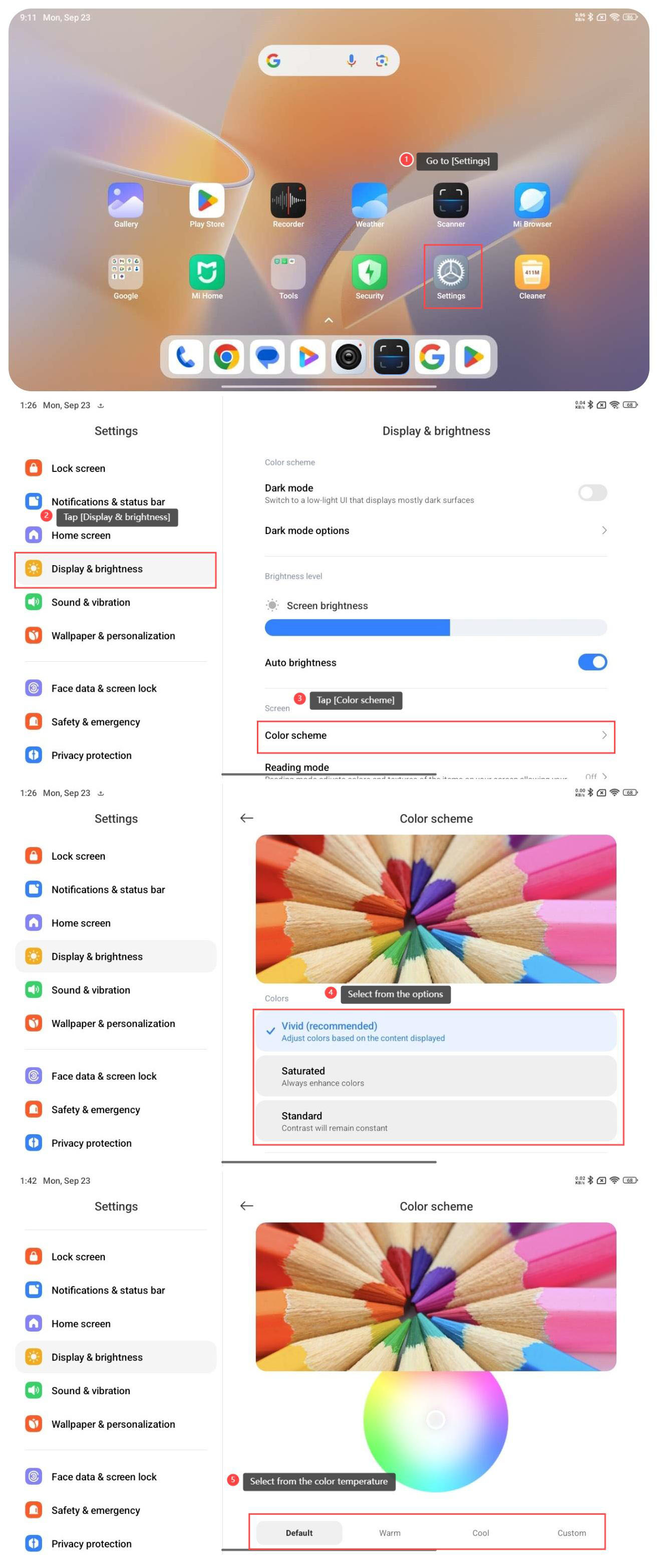 Redmi Pad SE 8.7 4G mendukung pengaturan skema warna, yang memungkinkan Anda menyesuaikan tampilan dan nuansa perangkat Anda agar sesuai dengan gaya atau preferensi. Warna tertentu dapat memengaruhi suasana hati dan suasana, menciptakan pengalaman penggunaan yang lebih menyenangkan. Skema warna yang konsisten dapat menciptakan antarmuka yang harmonis dan terorganisir, membuat navigasi lebih mudah.