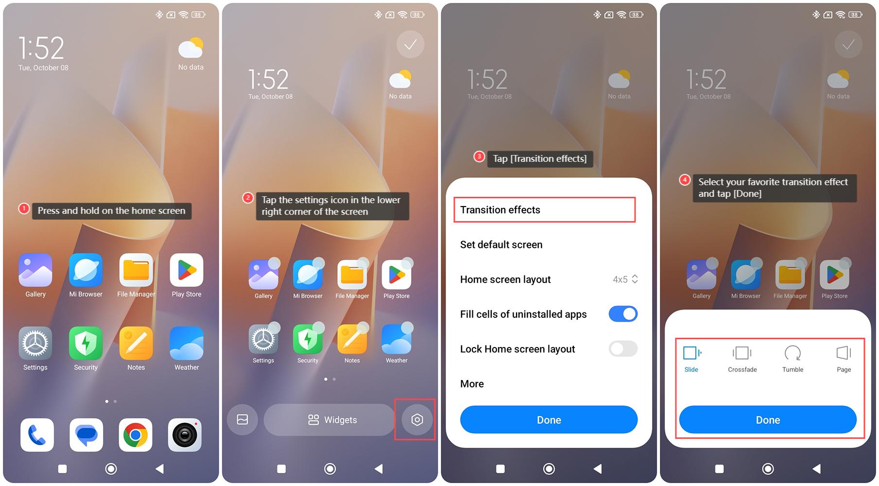 Efek transisi layar Home pada Redmi 13C 5G mengacu pada animasi yang terjadi saat Anda menavigasi antar halaman layar beranda. Efek ini, yang dapat mencakup animasi fade, slide, atau zoom, meningkatkan daya tarik visual antarmuka, membuatnya lebih menarik. Selain itu, transisi yang mulus dapat meningkatkan navigasi dengan memberikan isyarat visual yang membantu Anda memahami interaksi. Anda dapat menyesuaikan efek transisi untuk mencerminkan gaya pribadi Anda, menghasilkan pengalaman yang lebih personal.