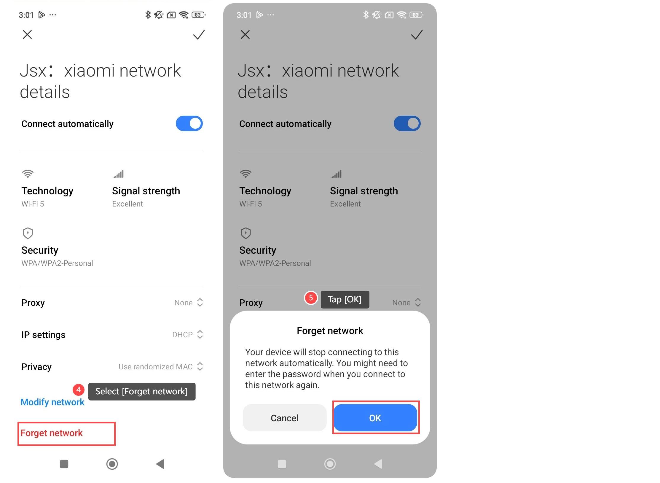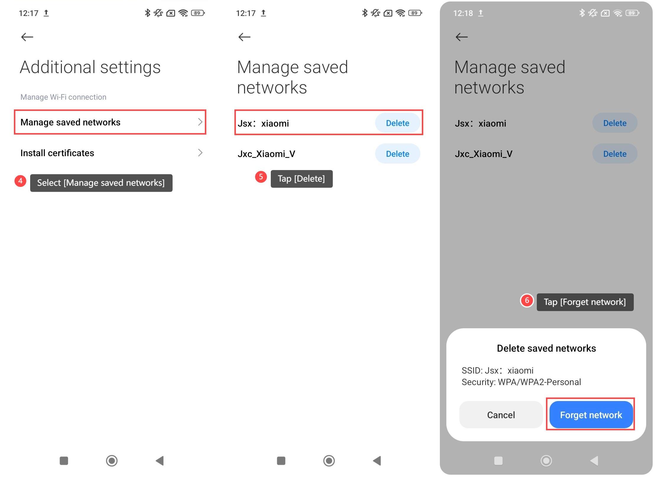 Melupakan jaringan Wi-Fi di Redmi 13C mengacu pada tindakan menghapus koneksi Wi-Fi yang disimpan dari perangkat. Ini berarti ponsel tidak akan lagi mengingat jaringan itu, dan Anda harus menyambungkan kembali secara manual dengan memasukkan kata sandi lagi jika Anda ingin menggunakannya di masa mendatang. Ini berguna jika Anda mengalami masalah koneksi atau jika Anda ingin menghapus jaringan yang tidak lagi digunakan. Untuk melupakan jaringan Wi-Fi di ponsel Anda, silakan lihat metode berikut: Metode 1: 1. Buka [Pengaturan]APPdi ponsel Anda; 2. Pilih [Wi-Fi]; 3. Ketuk [Pengaturan tambahan]; 4. Pilih [Kelola jaringan tersimpan]; 5. Pilih Wi-Fi yang ingin Anda lupakan dan tap [Hapus]; 6. Ketuk [Lupakan jaringan]. Metode 2: 1. Buka [Pengaturan]APPdi ponsel Anda; 2. Ketuk [Wi-Fi]; 3. Pilih Wi-Fi yang ingin Anda lupakan, dan ketuk [>] di sebelah kanan; 4. Pilih [Lupakan jaringan]; 5. Ketuk [OK], dan perangkat Anda akan melupakan jaringan. Nota: Jika Anda lupa jaringan, perangkat Anda akan berhenti terhubung ke jaringan ini secara otomatis. Anda harus memasukkan kata sandi saat terhubung ke jaringan lagi.