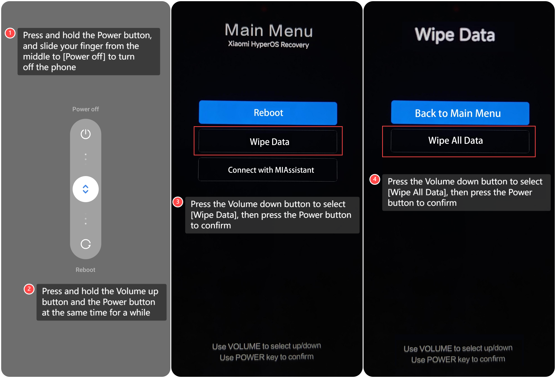 4. Tekan tombol Volume turun untuk memilih [Hapus Semua Data], lalu tekan tombol Daya untuk mengonfirmasi.