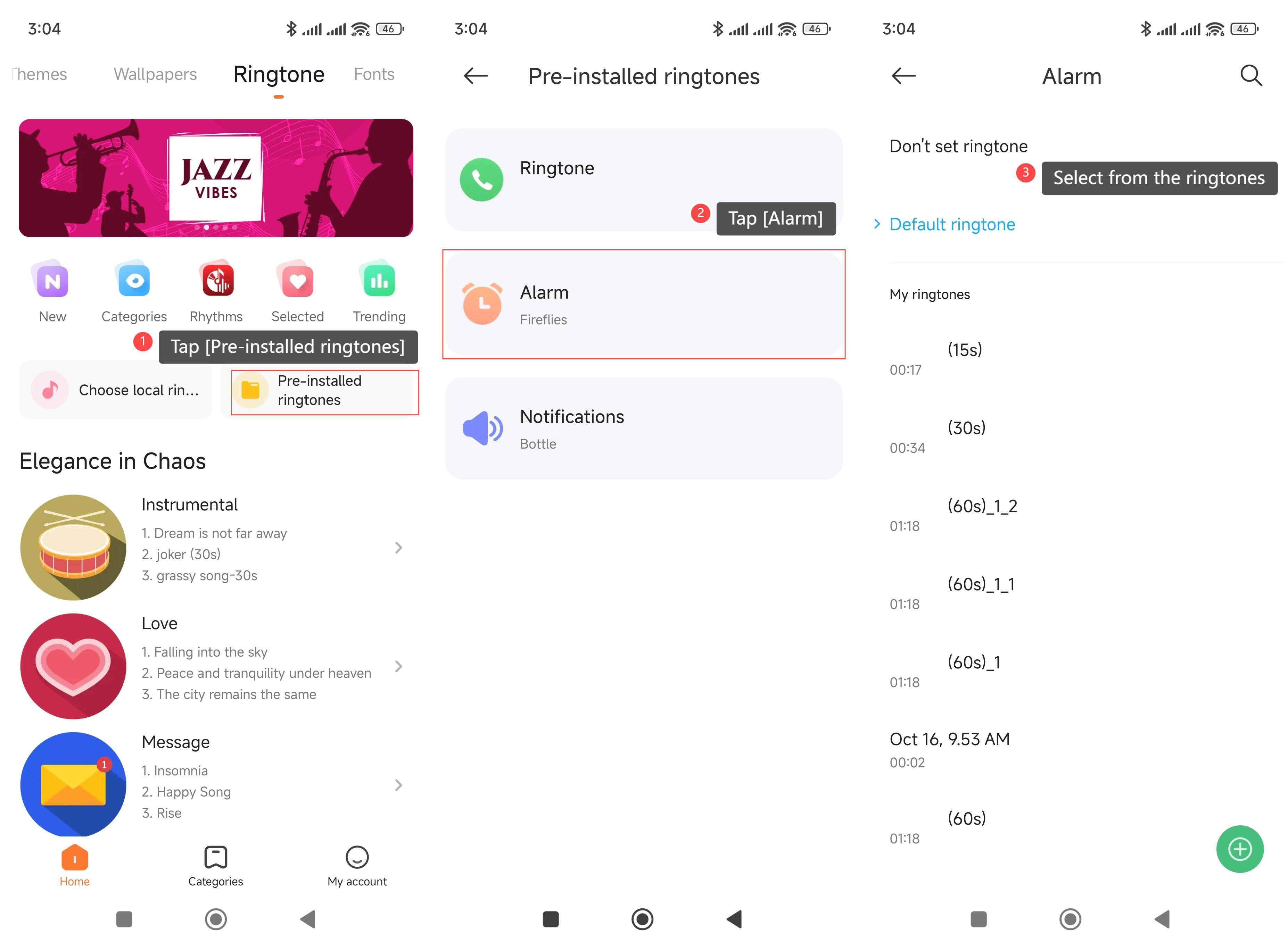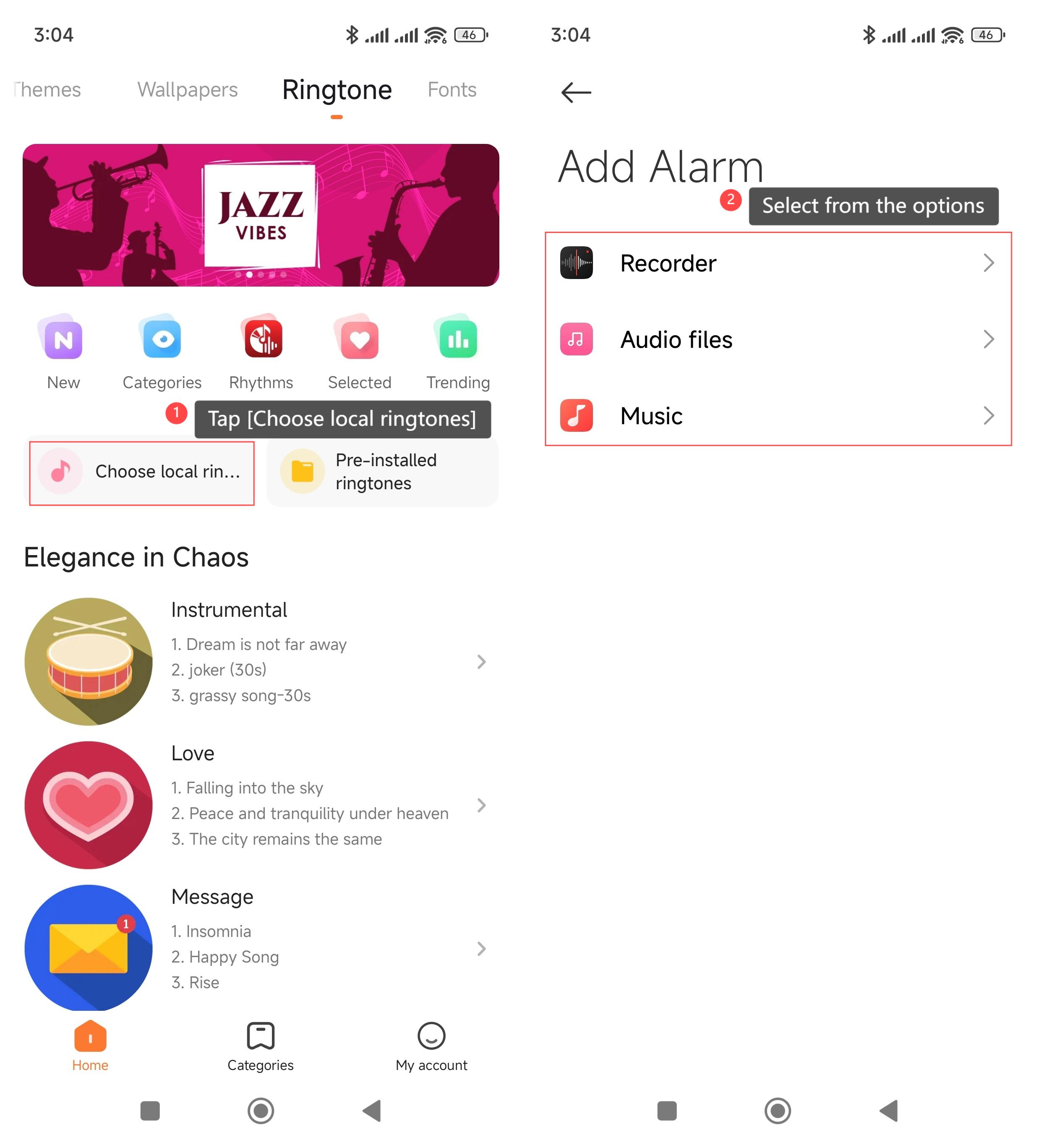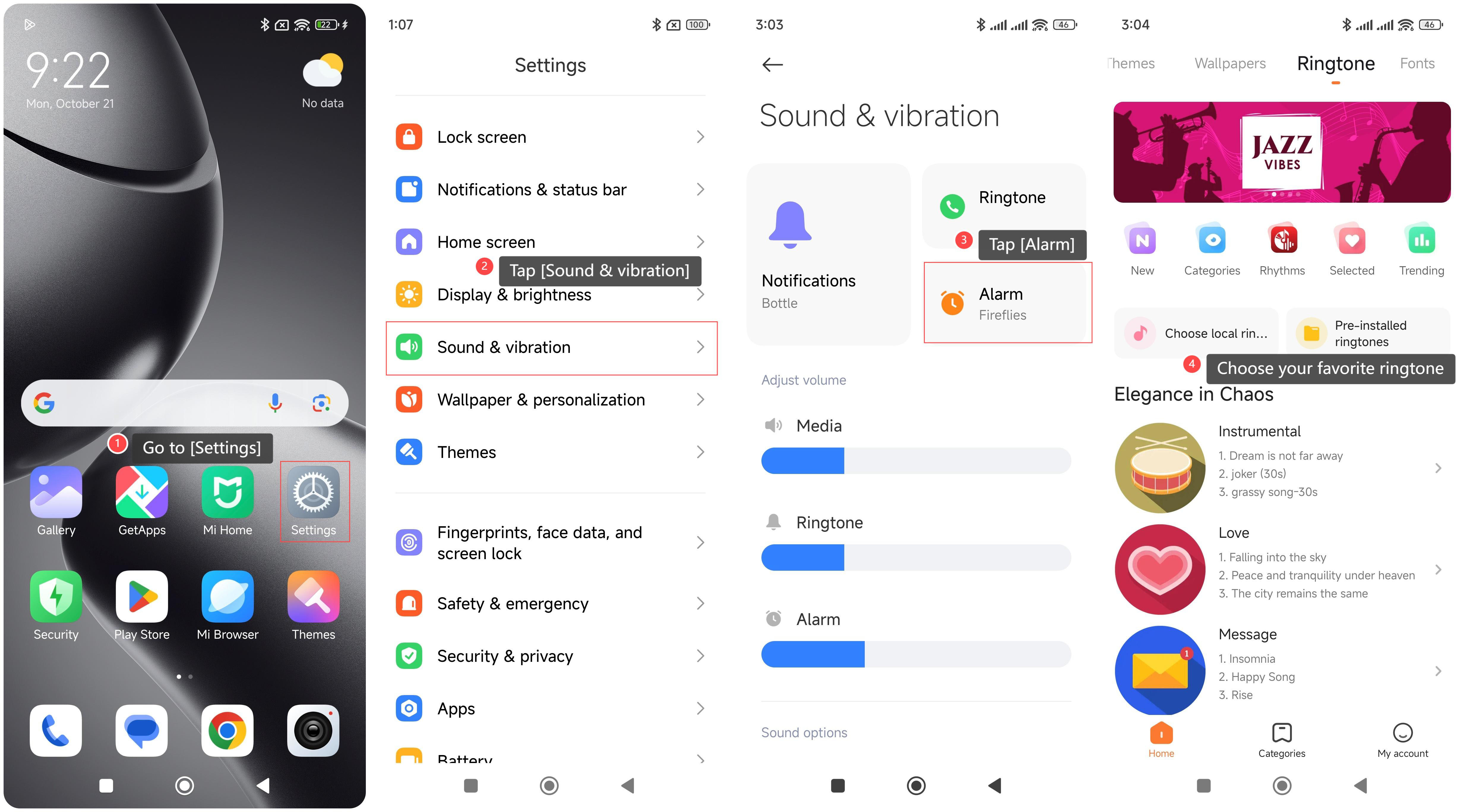 Nada dering untuk alarm pada Xiaomi 14T Pro dapat disesuaikan melalui pengaturan. Anda dapat memilih suara default atau mengatur nada yang dipersonalisasi untuk alarm. Memilih nada dering tertentu untuk alarm dapat membantu Anda bangun lebih efektif dengan memilih suara yang menurut Anda menyenangkan atau bersemangat. Ini dapat menciptakan asosiasi positif dengan bangun, membuatnya tidak terlalu menggelegar. Untuk memilih nada dering alarm di ponsel Anda, silakan lihat langkah-langkah berikut: 1. Buka [Pengaturan]; 2. Ketuk [Suara & getaran]; 3. Ketuk [Alarm]; 4. Pilih nada dering favorit Anda. Untuk memilih nada dering yang sudah diinstal sebelumnya, silakan lihat langkah-langkah berikut: 1. Ketuk [Nada dering yang sudah diinstal sebelumnya]; 2. Ketuk [A larm]; 3. Pilih dari nada dering. Untuk memilih nada dering lokal, silakan lihat langkah-langkah berikut: 1. Ketuk [Pilih nada dering lokal]; 2. Pilih nada dering dari [Perekam], [File audio], dan [Musik].