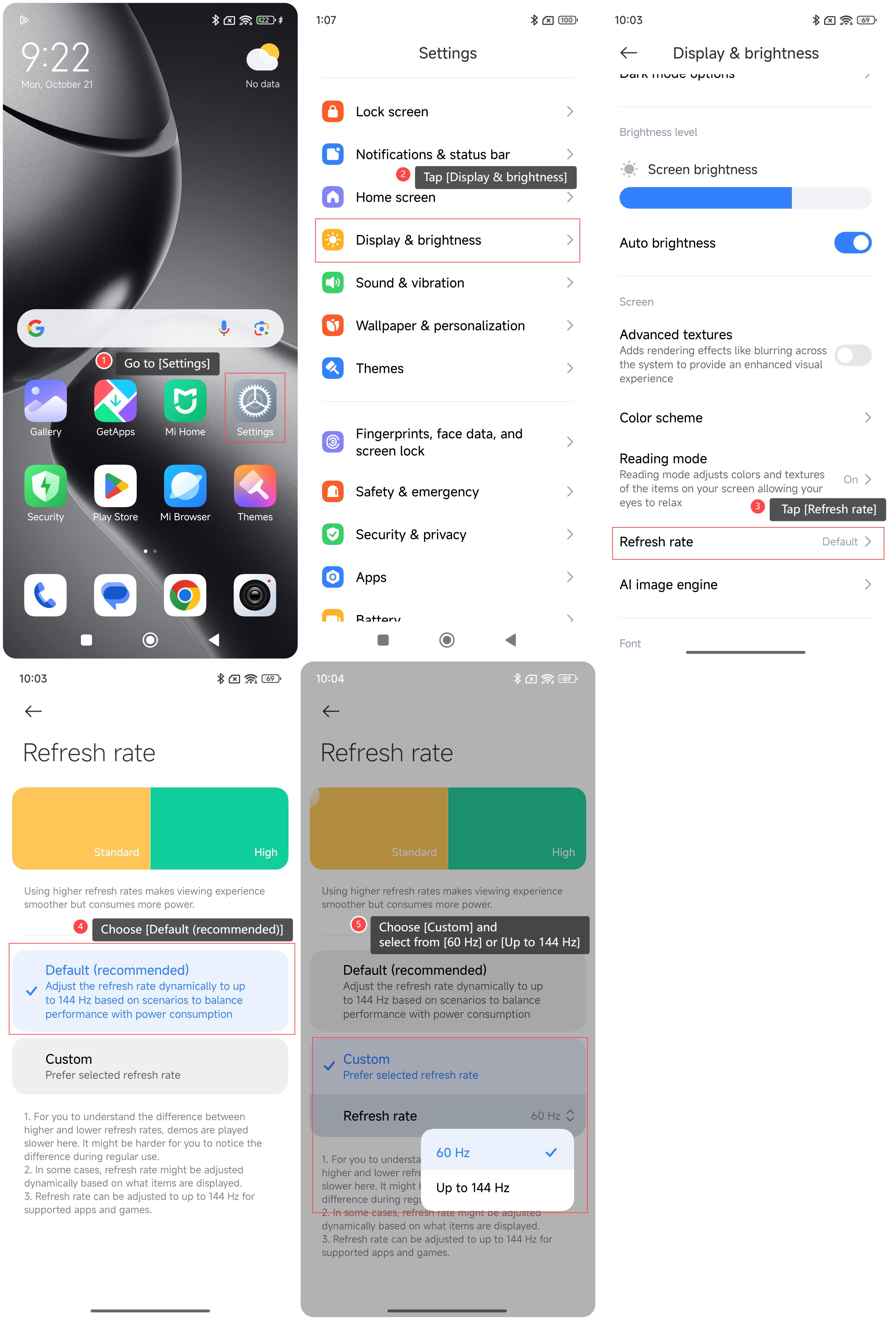 5. Pilih [Kustom] dan Anda dapat mengetuk [60 Hz] atau [Hingga 144 Hz] untuk mengatur kecepatan refresh yang Anda inginkan.